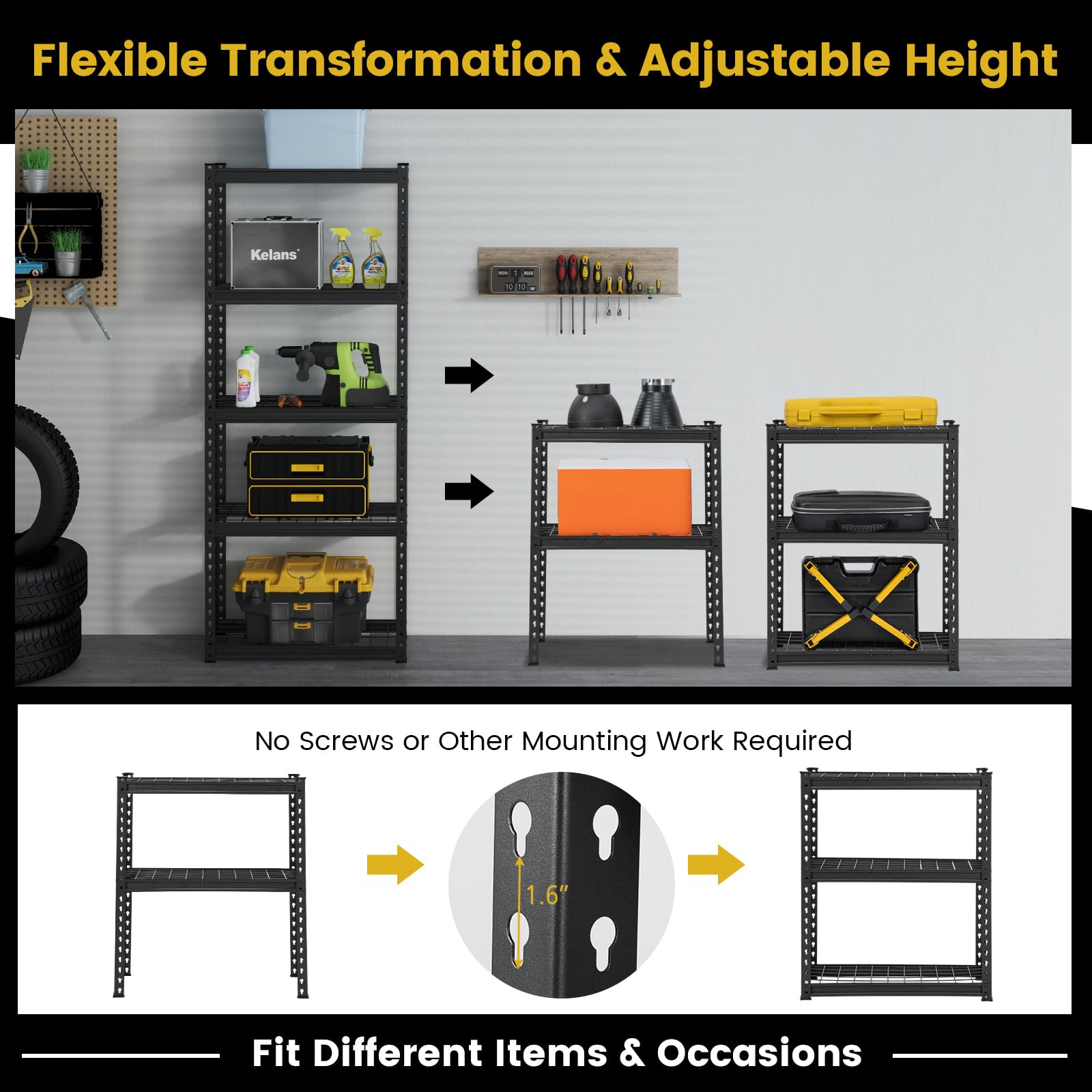- Flexible Transformation & Adjustable Height: The 5-tier garage shelving can be divided into 2 small shelves for flexible use. Besides, you can adjust the height of the shelves to meet different storage needs of different sized items.