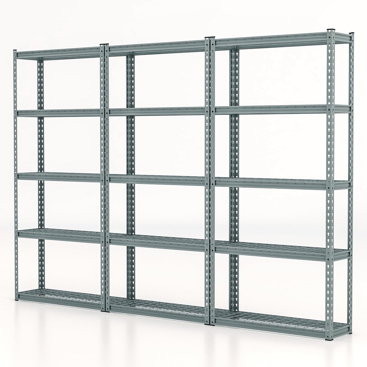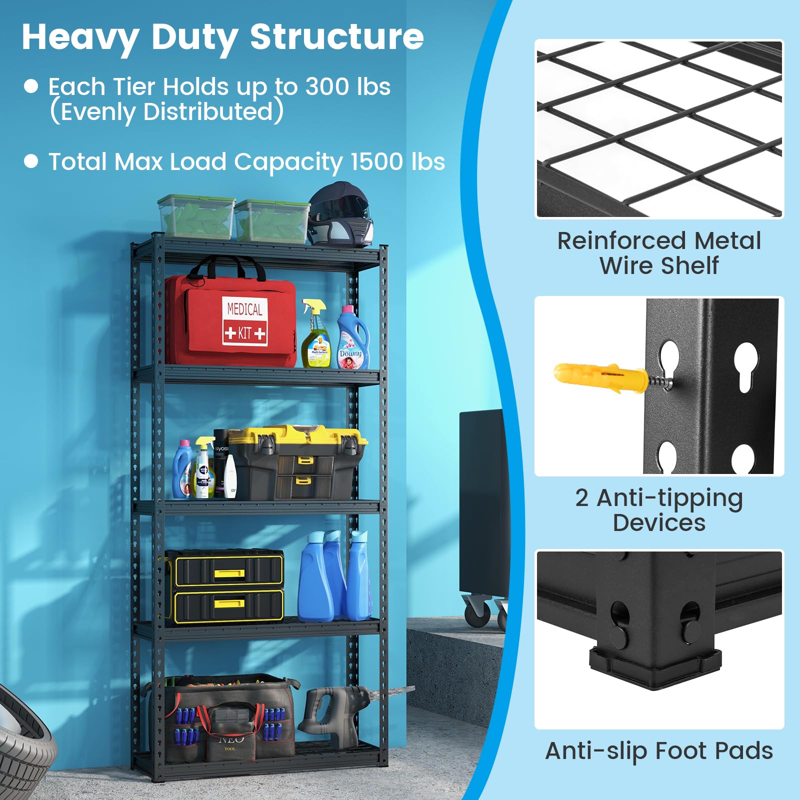 - Durable Material & Upgraded Security: Solid metal with rust-proof powder coating ensures good deformation resistance and long-lasting use. 2 anti-tipping devices keep the garage shelving stable and safe to use. Plus, anti-slip foot pads not only enhance stability, but also protect the floor.