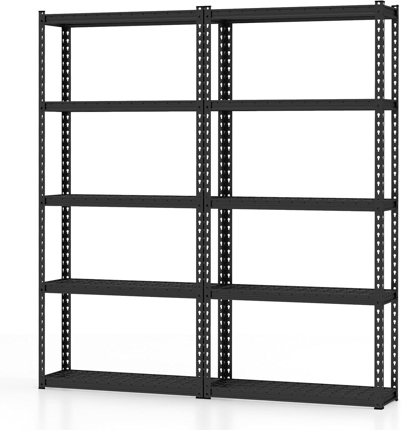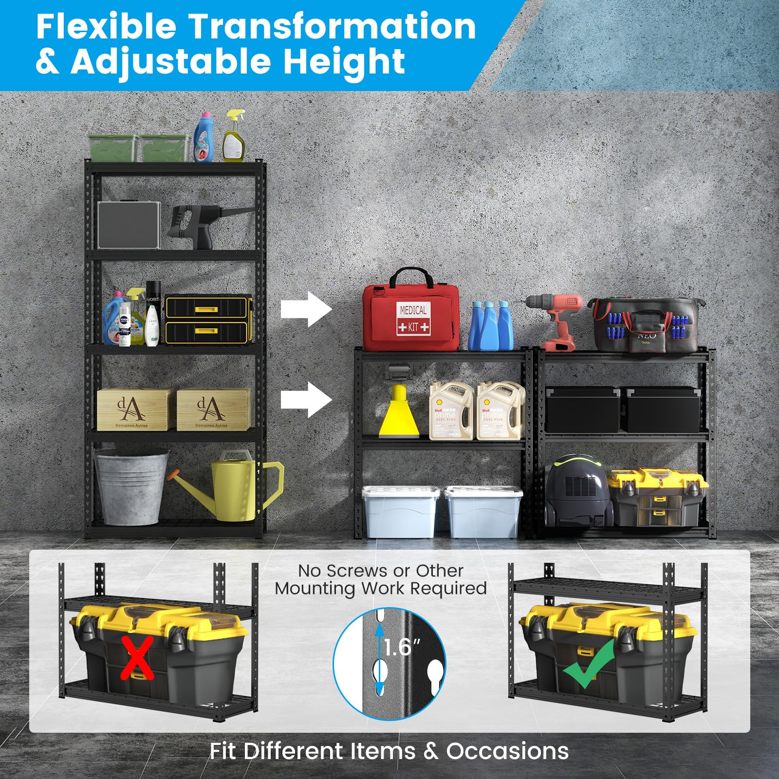 - Flexible Transformation & Adjustable Height: The 5-tier garage shelving can be divided into 2 small shelves for flexible use. Besides, you can adjust the height of the shelves to meet different storage needs of different sized items.