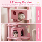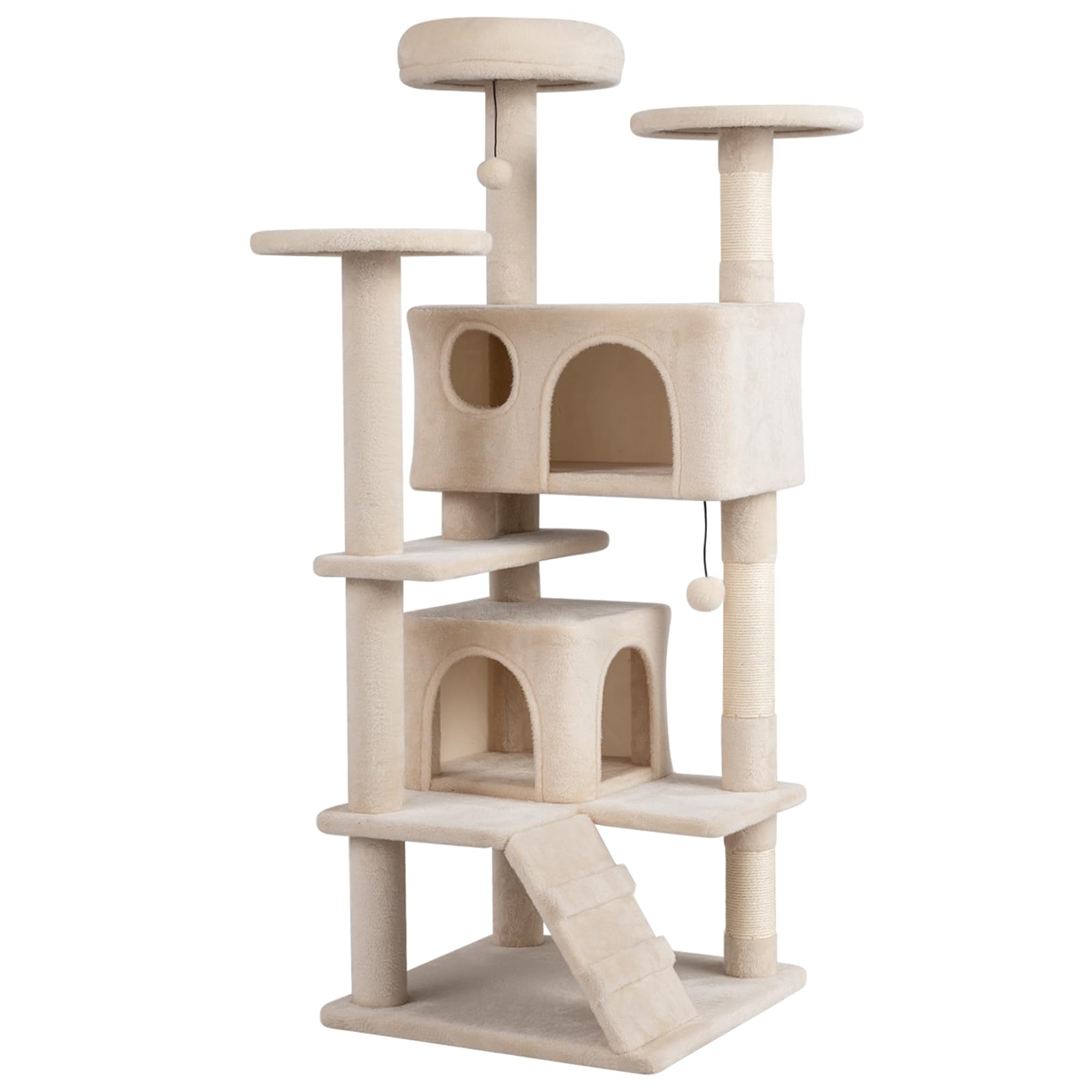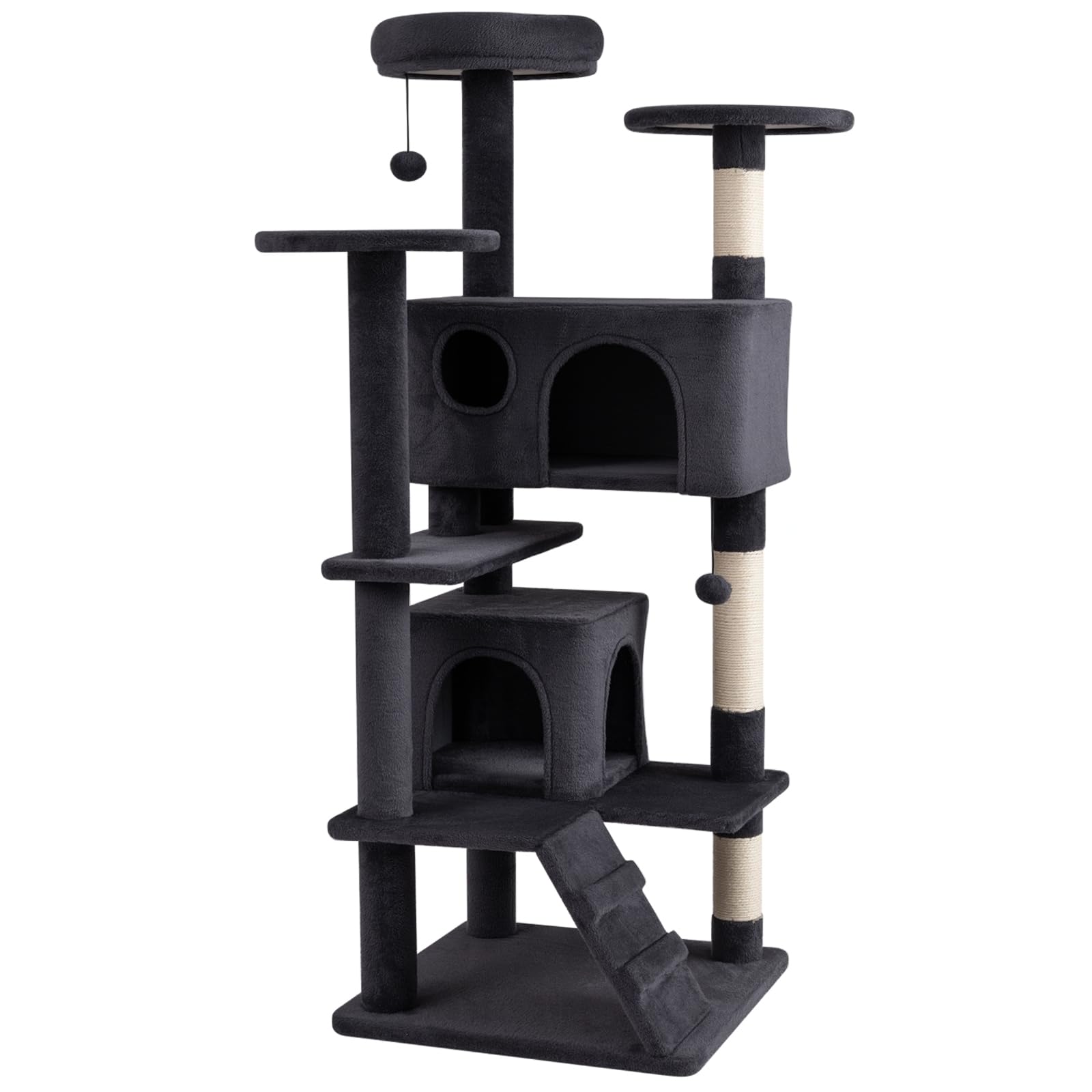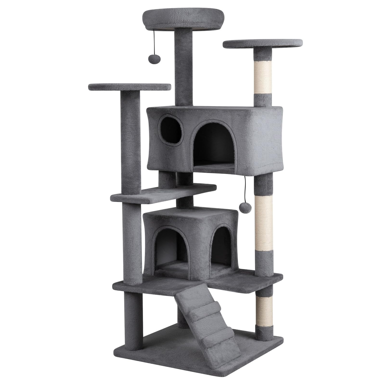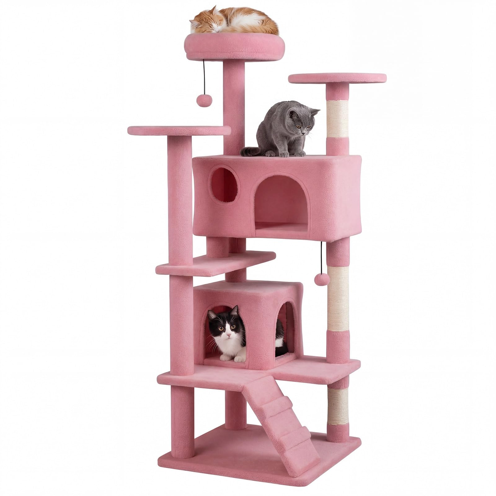 Standing 52”/132 cm tall, this multi-level structure combines sturdy sisal scratching posts, softly padded perches, and enclosed condos into one functional climbing solution. A reinforced base and anti-tipping device enhance stability during active play, while the layered layout and playful accessories provide both exercise and relaxation. In addition, it is ideal for indoor cats who enjoy vertical exploration, comfort, and variety in their daily routine.