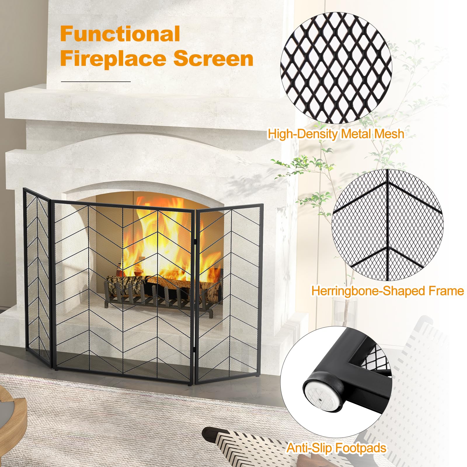 The fireplace screen measures 52" x 31" and features a high-density metal mesh that effectively blocks sparks and ashes, ensuring the safety of kids, pets, and furniture. Made of premium metal, the main frame is rustproof, solid, and can withstand the extreme heat near the fireplace. The decorative herringbone patterns on the 3 panels add an attractive touch to your home decor. Plus, with 3-panel foldable design, this fire guard is easy to store and carry. All in all, this fireplace screen combines functionality with aesthetic appeal, making it an ideal addition to any indoor occasions.