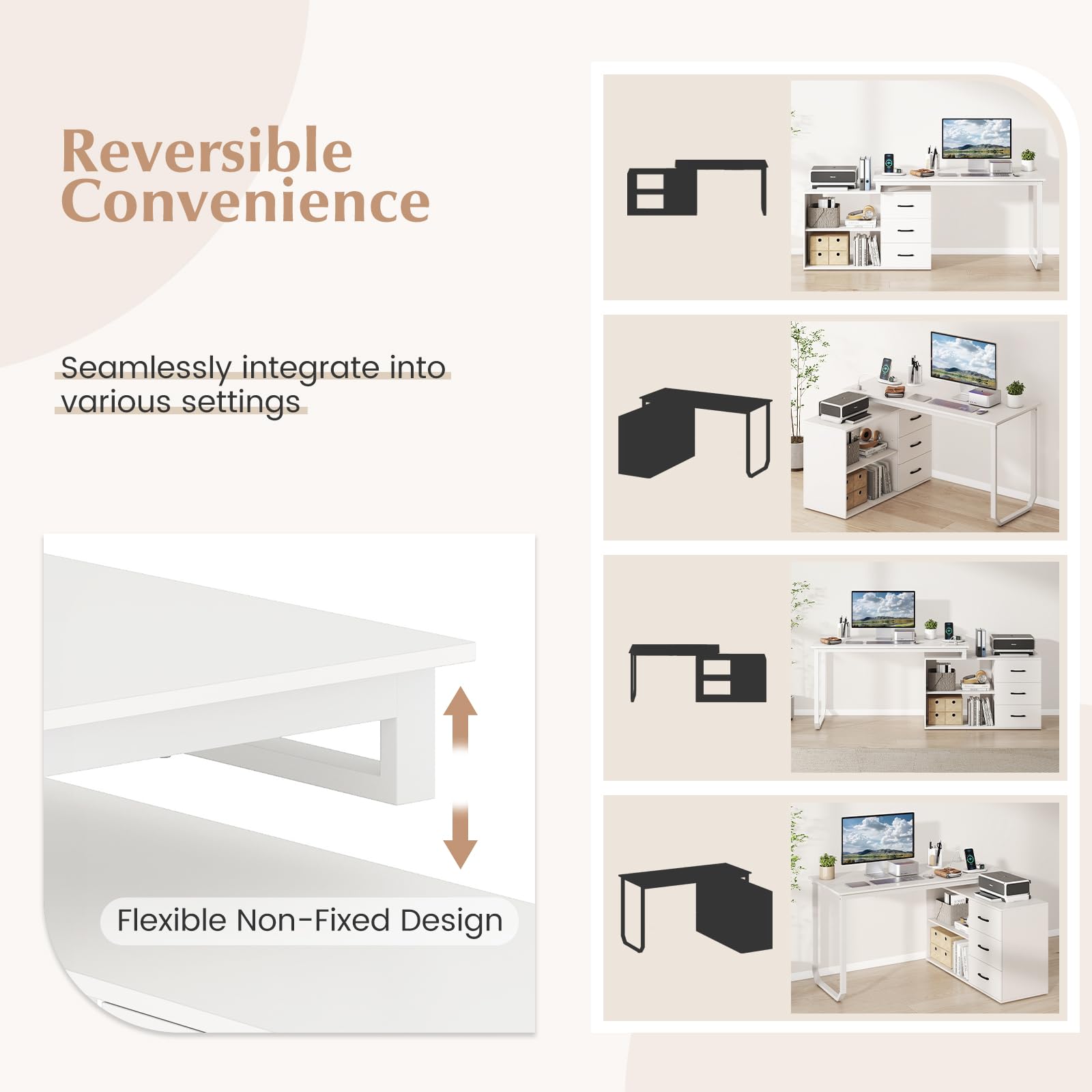 Flexible non-fixed design of the tabletop offers reversible convenience