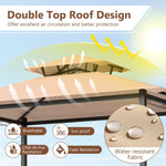 This outdoor patio bar set is a stylish and functional addition to your outdoor living space. This 3-piece set boasts an innovative double top roof design that promotes excellent air circulation, coupled with a sun-proof and water-proof canopy fabric that ensures comfort and durability in any weather condition. This set offers a wide tempered glass tabletop and 2-tier slatted metal shelves on three sides, providing ample room for your food, drinks, and utensils, while the 4-row top glass holders keep your wine glasses organized and within reach. Moreover, the canopy also equips tires for further stability. Constructed with heavy-duty powder-coated metal frames, this outdoor set promises long-term outdoor use, the 4 sturdy ground stakes and an X-shaped top structure add extra stability to the entire frame. Hence, this 3-piece patio set is ideal for backyards, patios, and poolsides.