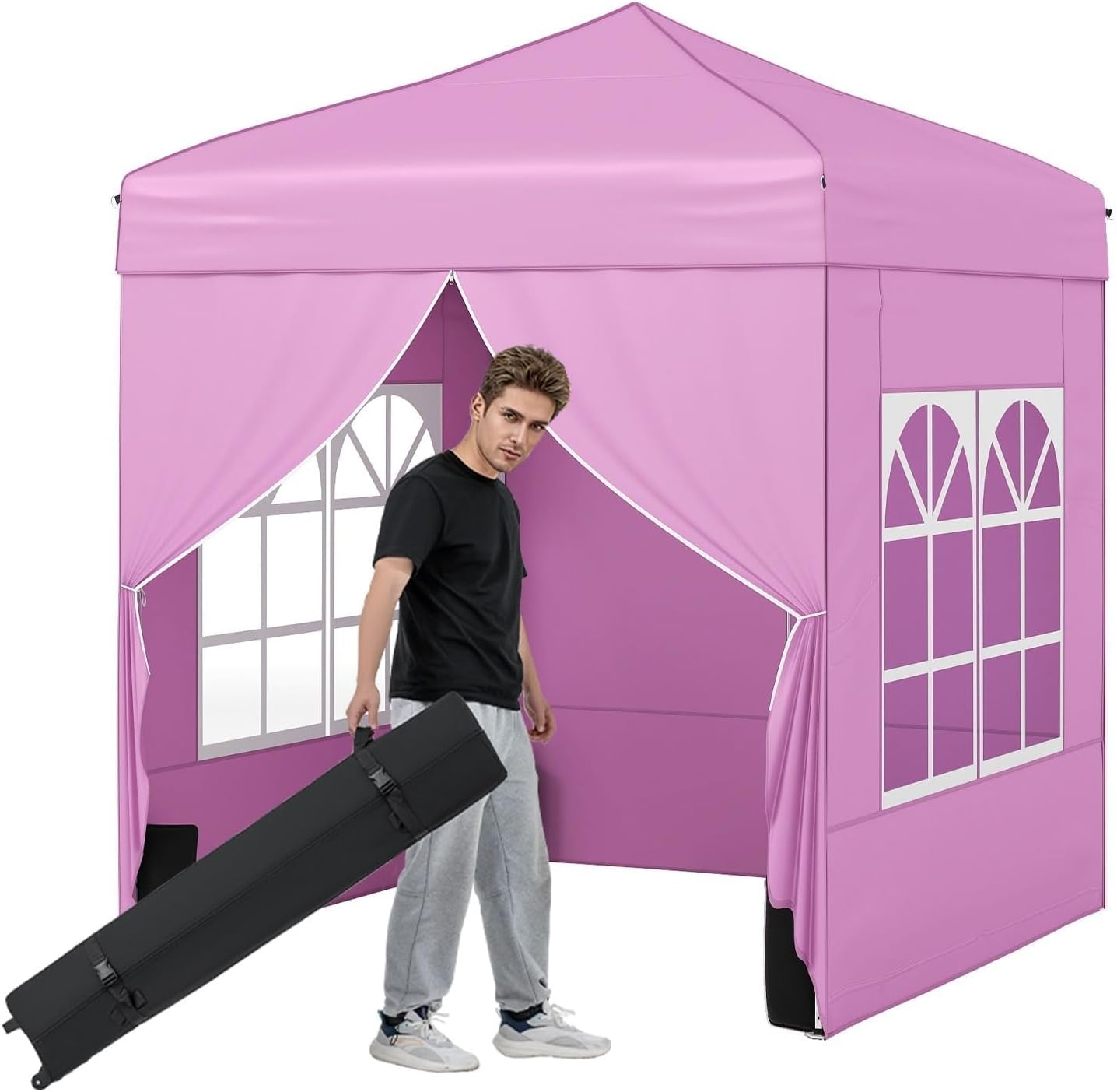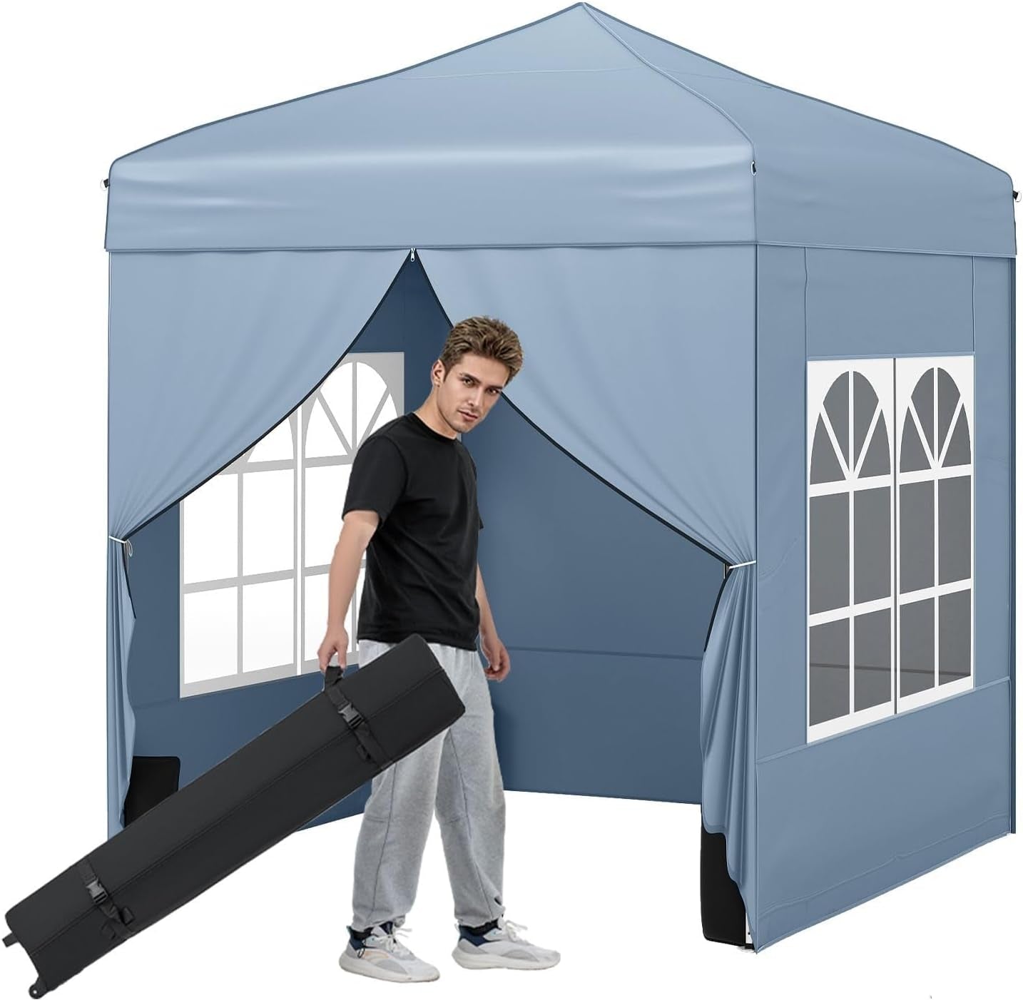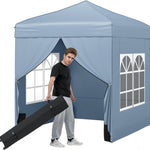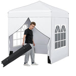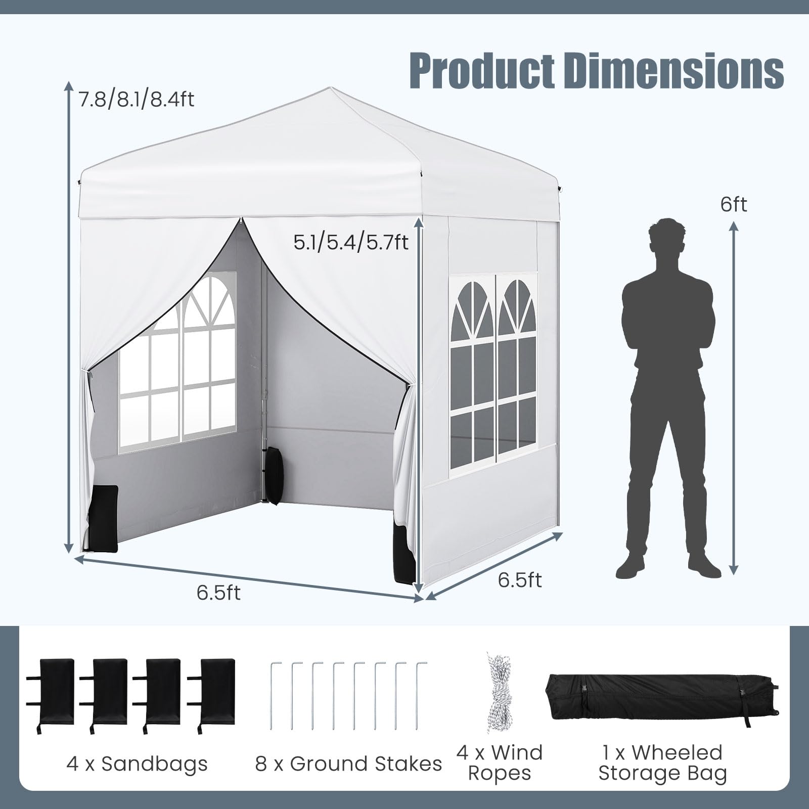 Our foldable and portable canopy tent measures 6.5 x 6.5 x 7.8-8.4 ft (L x W x H) and comes with 4 detachable sidewalls - 2 with zippered doors for easy entry and two with clear windows for airflow and light, designed for effortless outdoor shelter wherever you need it. Its robust truss carbon steel frame provides reliable support, while reinforced sandbags, ground stakes, and wind ropes secure the tent against unexpected breezes. The high-quality oxford cloth top features a protective silver coating, offering dependable sun and weather protection for outdoor gatherings, backyard parties, and vendor events. Easy to transport with a wheeled storage bag and quick to set up without tools, this canopy is a practical addition to any outdoor activity.