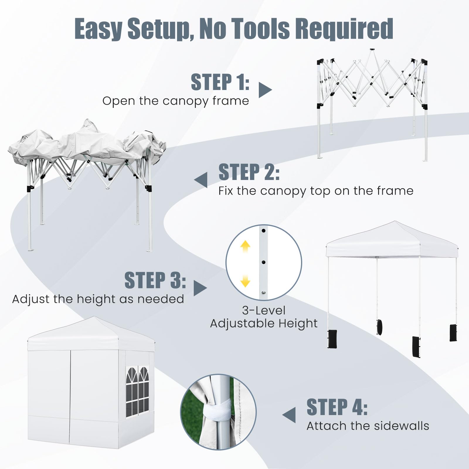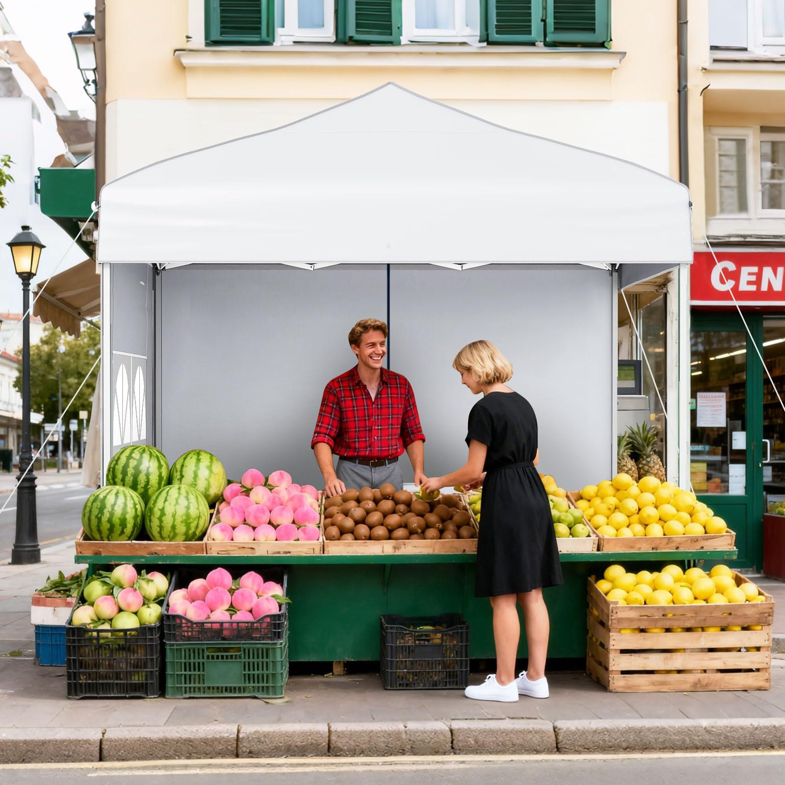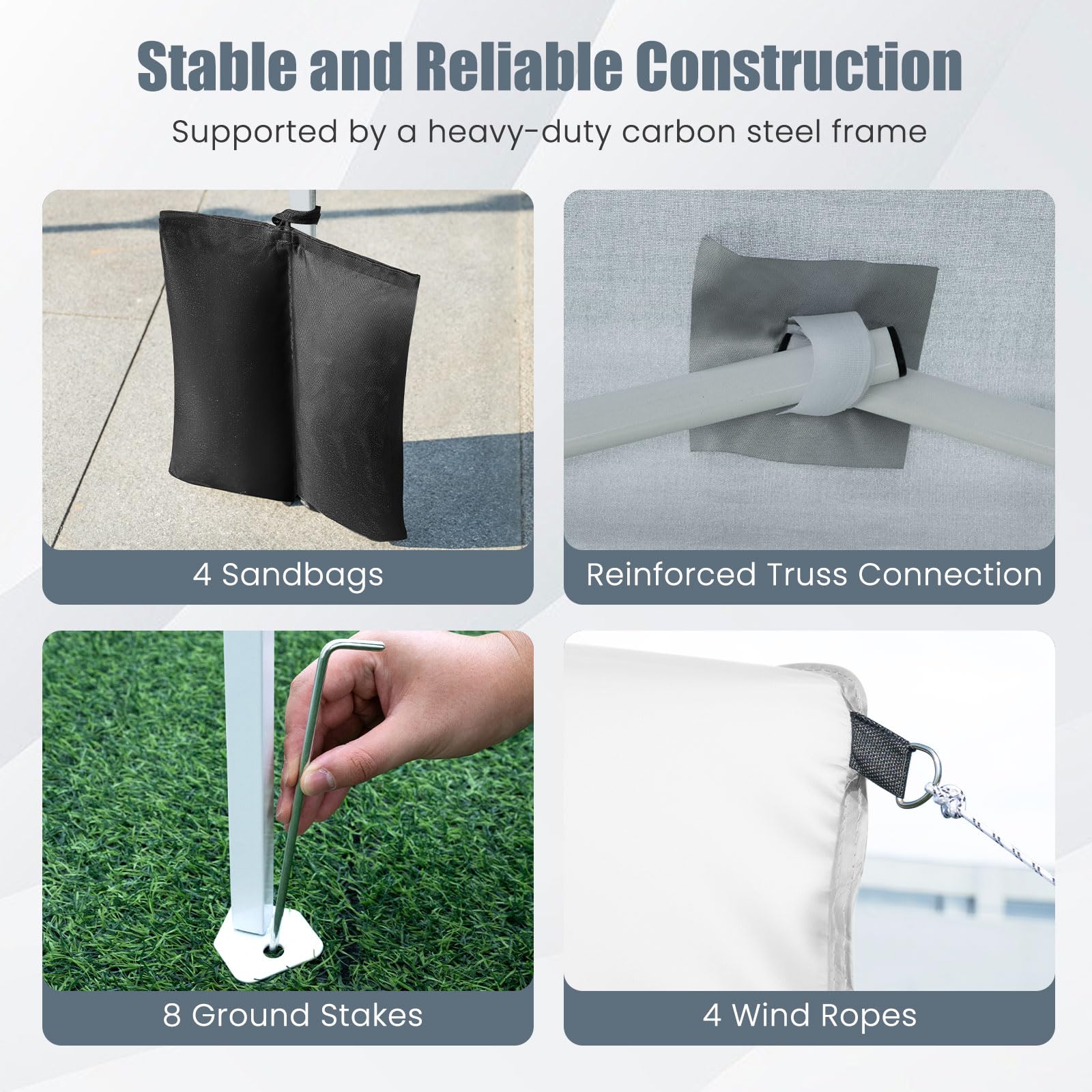 Our foldable and portable canopy tent measures 6.5 x 6.5 x 7.8-8.4 ft (L x W x H) and comes with 4 detachable sidewalls - 2 with zippered doors for easy entry and two with clear windows for airflow and light, designed for effortless outdoor shelter wherever you need it. Its robust truss carbon steel frame provides reliable support, while reinforced sandbags, ground stakes, and wind ropes secure the tent against unexpected breezes. The high-quality oxford cloth top features a protective silver coating, offering dependable sun and weather protection for outdoor gatherings, backyard parties, and vendor events. Easy to transport with a wheeled storage bag and quick to set up without tools, this canopy is a practical addition to any outdoor activity.