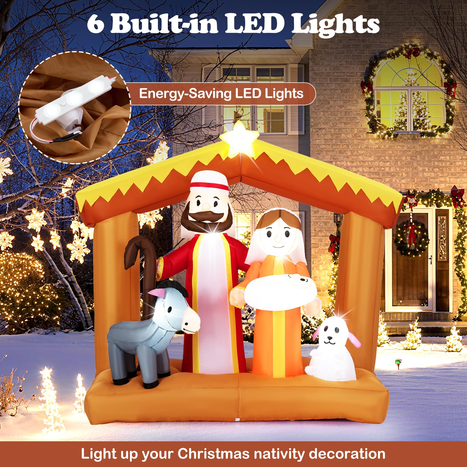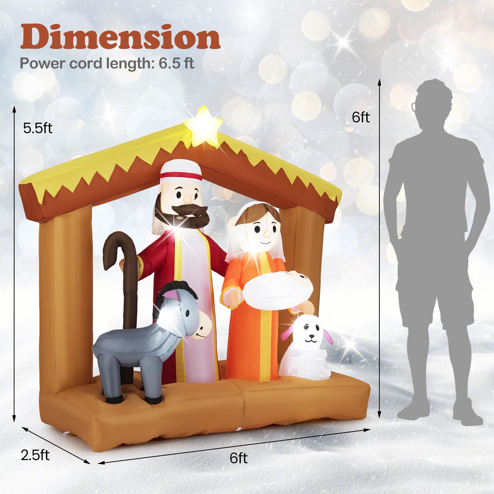Featuring 6 built-in LED lights, this nativity figure is illuminated to stand out beautifully in both day and night displays. Crafted from thickened polyester fabric, this weather-resistant decoration is designed to withstand rain, wind, snow, and fading. Setting up takes just about 60 seconds, and deflation is quick and simple with the zipper for compact storage. Enhanced stability comes from included windproof ropes, sturdy ground stakes, and a built-in sandbag, making this inflatable ideal for front yards, gardens, churches, or patios.
