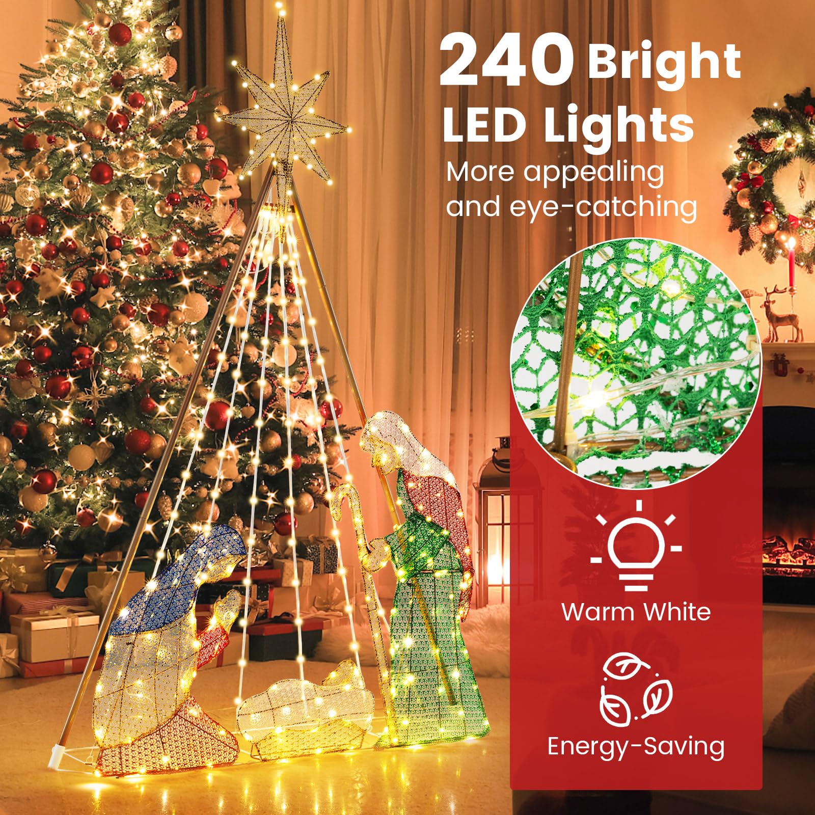 - 240 Bright LED Lights: The nativity scene set is adorned with 240 bright and energy-saving LED lights that cast a warm glow over the entire display. These warm white lights are not only long-lasting but also add a touch of festive cheer.