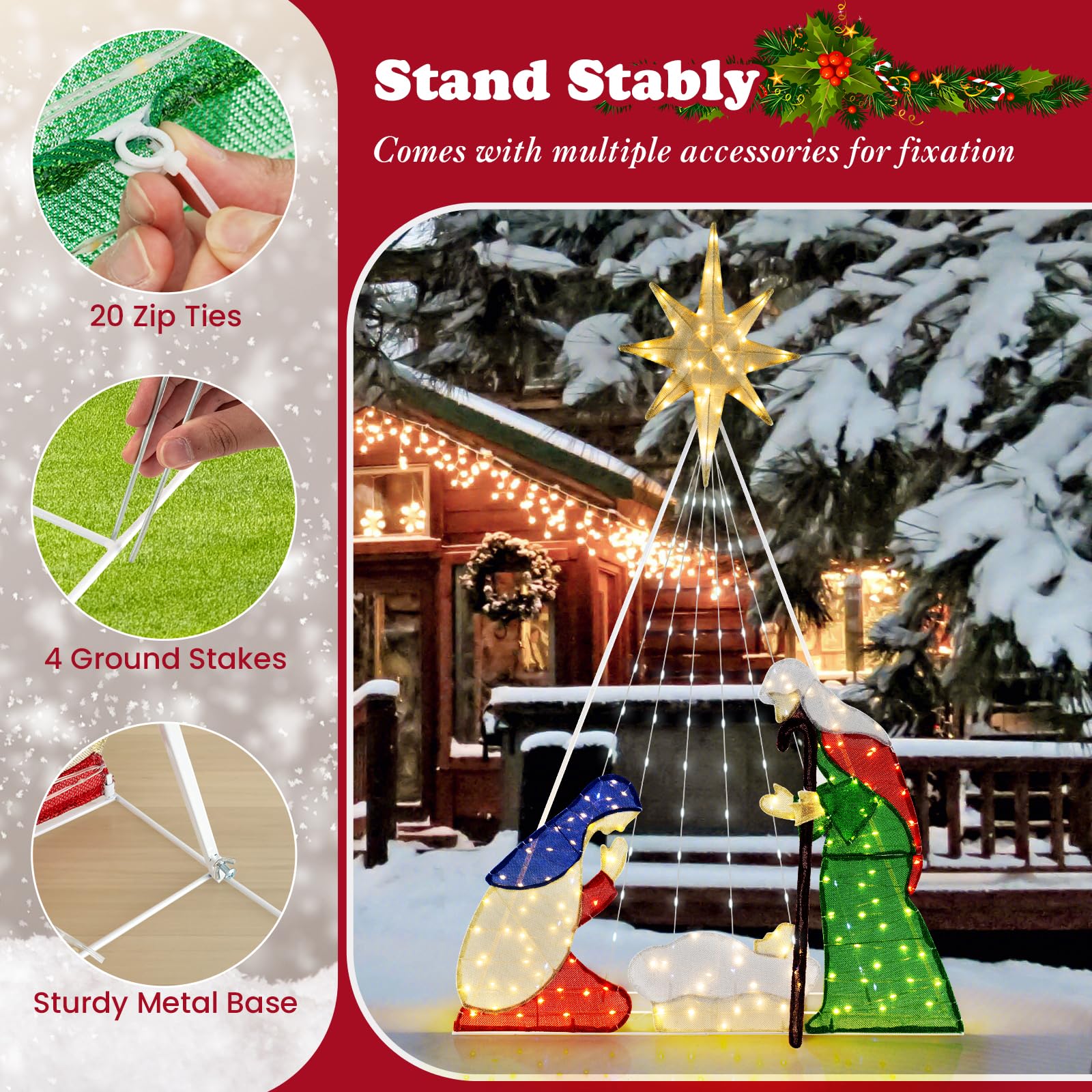 - Stand Stably: Engineered for stability, this Christmas nativity set is firmly anchored using 20 zip ties and 4 ground stakes to withstand outdoor conditions. Additionally, the sturdy metal base fortifies its structure, ensuring reliable setup.