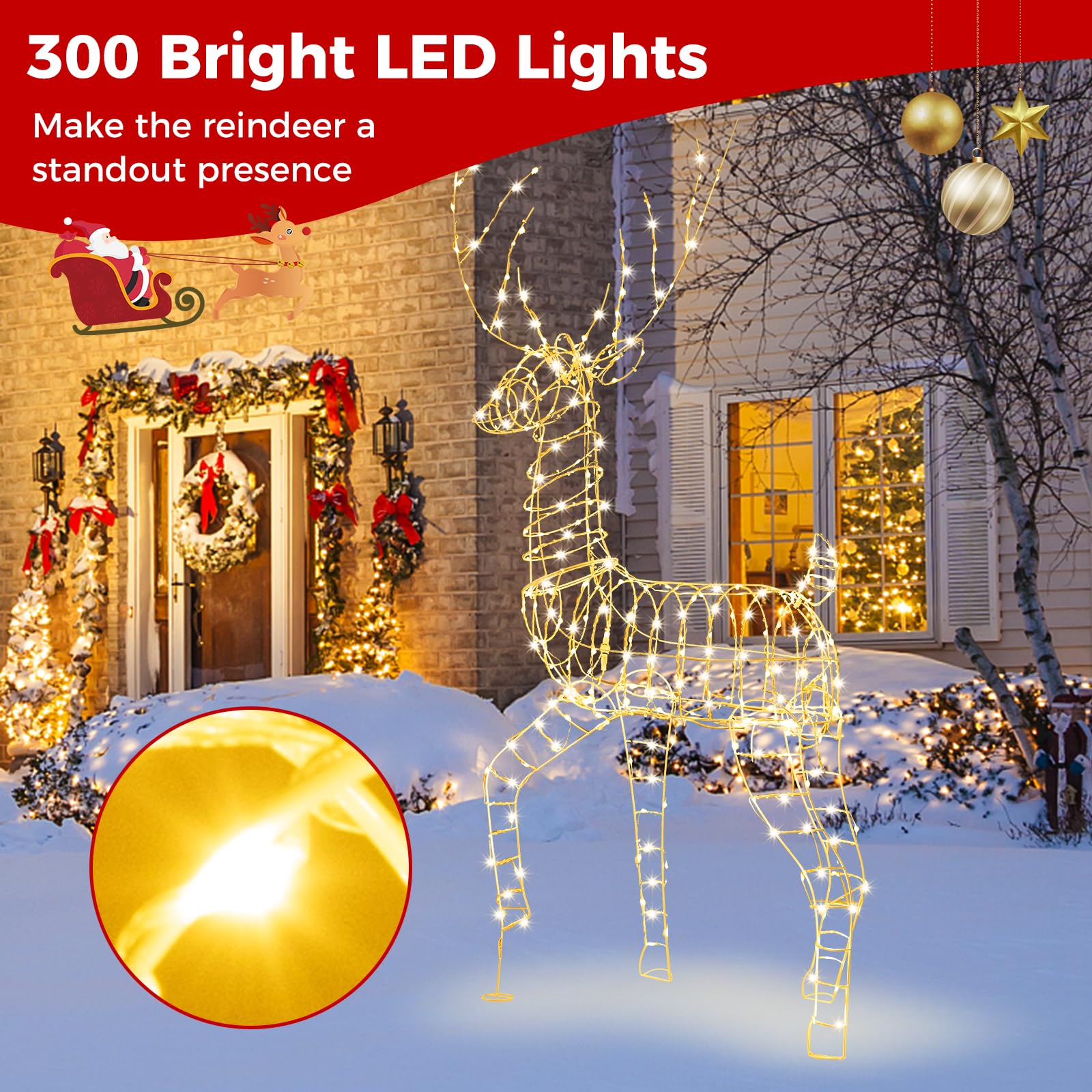 - 300 Captivating LED Lights: This enchanting 3D reindeer comes alive with 300 warm white LED lights, casting a festive ambiance that brightens your Christmas celebrations. The bright lights make the deer a dazzling addition to any holiday display.