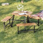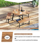Ideal for family gatherings, this picnic table bench set seats up to 6 people. The acacia wood tabletop and benches are sturdy, enduring, and painted for convenient maintenance. Featuring a coverable umbrella hole, the camping table set offers flexibility for sunny days. Insert a parasol (not included) for instant shade, or cover it up to reveal a perfectly flat tabletop. Its heavy duty metal frame, added crossbars, and adjustable foot pads ensure stability, supporting up to 220 lbs on the table and 500 lbs on each bench. Made of natural material, with measurements of 75"L x 65"W x 27.5"H, this versatile set is a stylish addition to gardens, patios, decks, lawns, porches, and poolside areas.