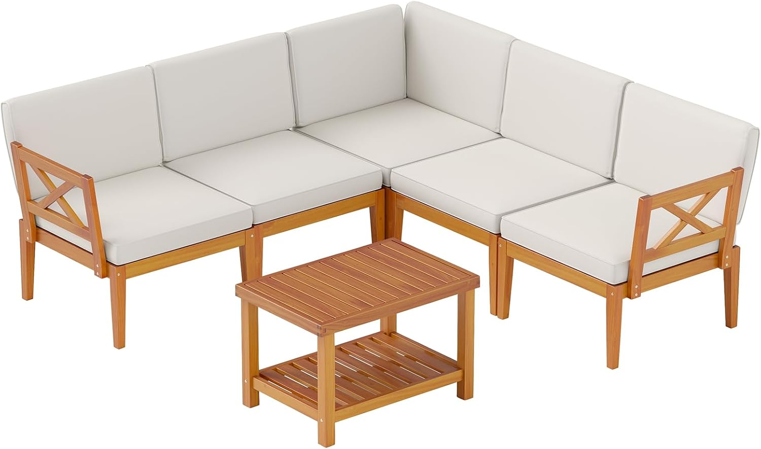 - Natural Aesthetic Appeal: The rich, natural wood grain of this acacia wood corner patio furniture set enhances any outdoor setting, seamlessly blending with the beauty of your garden, porch, lawn, poolside and backyard.