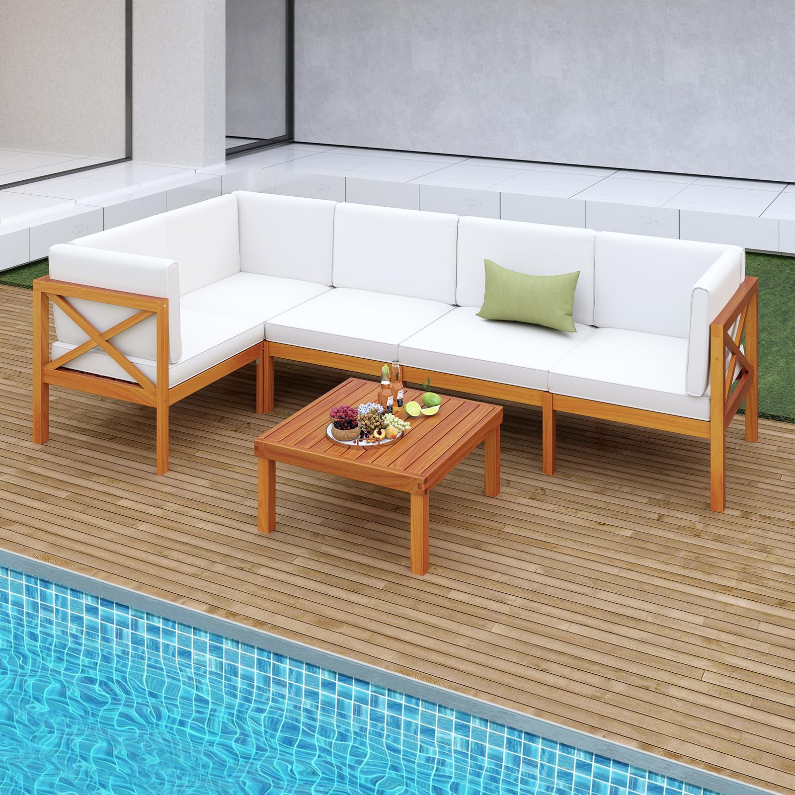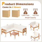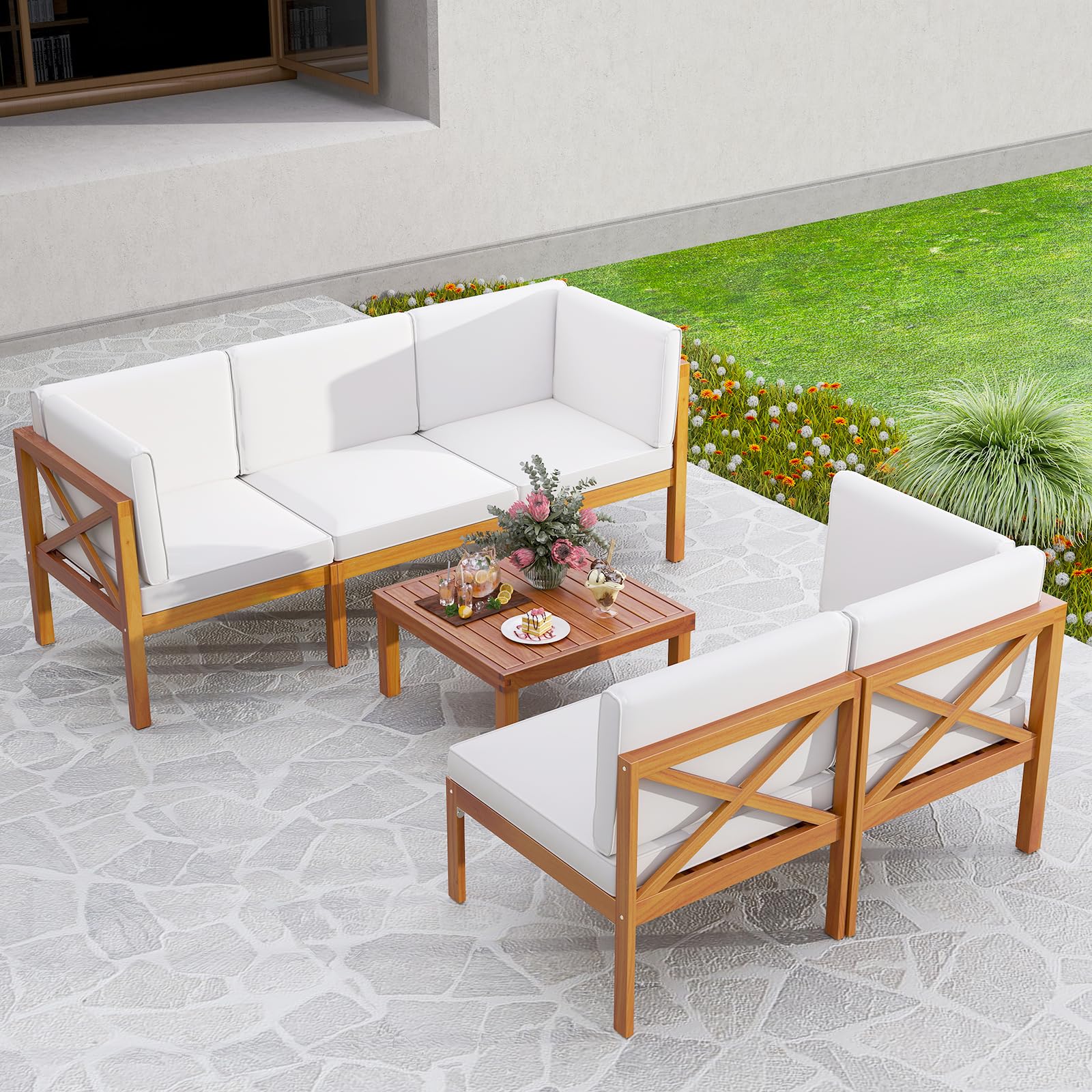 Transform your garden, porch, poolside or backyard into a comfortable retreat with our 6-piece patio furniture set.Crafted from high-quality acacia wood, this patio set is not only sturdy and stable but also enhances the visual appeal of any outdoor space with its rich natural wood grain. This outdoor conversation set includes comfortably thick cushions with removable and washable covers, providing both exceptional comfort and easy maintenance. Its modular design comprises various pieces including sofas and a square coffee table, allowing for flexible arrangement options to suit different occasions, from intimate gatherings to larger social events. Note: Please avoid rain exposure for prolonged service life.