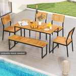 This outdoor table and chairs set thoughtfully includes a rectangular table with a convenient 2” umbrella hole fitting nicely on the 55” x 27.5” tabletop, 4 ergonomic patio chairs and a spacious bench, ensuring comfortable seating for 6 people. Crafted from solid acacia wood with a splinter-free surface, this outdoor dining set combines durability with natural beauty, while the sturdy metal frame construction supports up to 400 lbs per chair and 800 lbs for the bench.