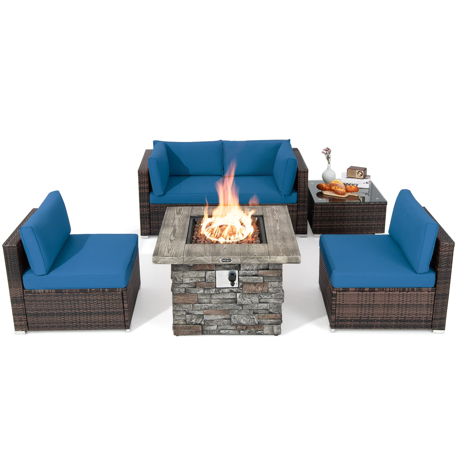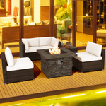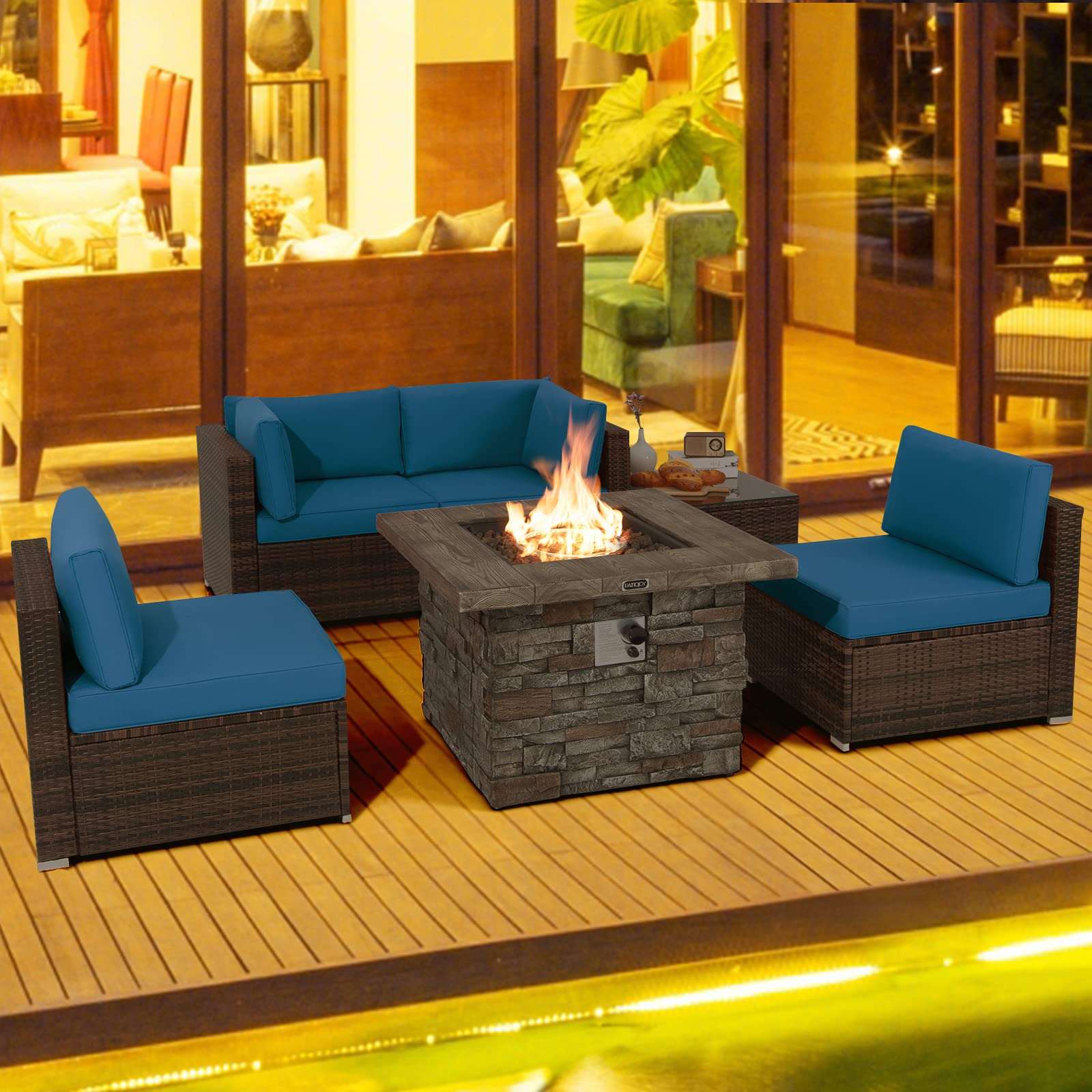- Multiple Combining Ways: This patio set includes 1 fire table, 1 coffee table, 2 corner sofas, and 2 armless sofas. You can arrange the 6 pieces as you like to fit different sizes of places. The coffee table with tempered glass top allows you to easily fetch items you want. This rattan set will be a perfect addition to a backyard, poolside, garden, and so on.