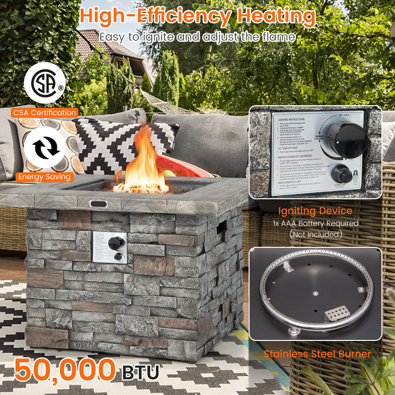 - 2-in-1 Fire Pit Table with PVC Cover: The 34.5"square fire table comes with lava rocks, a protective PVC cover, a touch-up pen, and a natural gas orifice. The fire table can be perfectly used for heating on winter days with 50,000 BTU heat output and a convenient igniting device. Also, it's a perfect patio coffee table when the lid is covered. Certificated by CSA, the fire pit table is safe to operate. Moreover, the stone-like appearance and wood-like tabletop make it quite eye-catching.