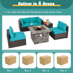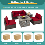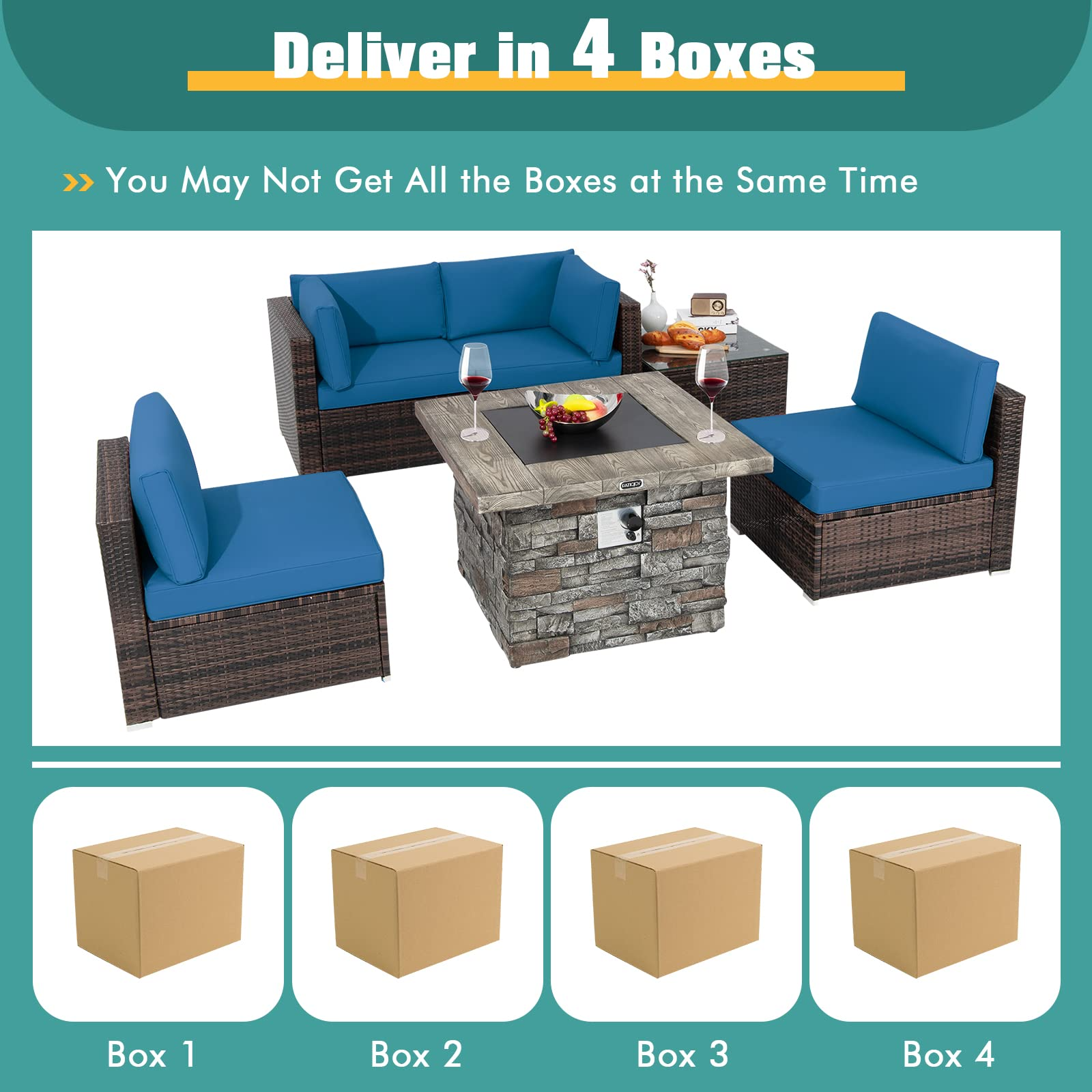 - 4-Package Delivery: This 6-piece patio set will be delivered in 4 packages so the arrival time may be different. The installing accessories for the coffee table and sofas are in box 1 of the sofa set. What's more, there is no need to assemble the fire pit table, which is quite effort-saving. Dimension: firepit table: 34.5"x 34.5"x 24"(L x W x H), coffee table: 26"x 26"x 13"(L x W x H), armless sofa: 29"x 26"x 25"(L x W x H), corner sofa: 29"x 29"x 25 (L x W x H).