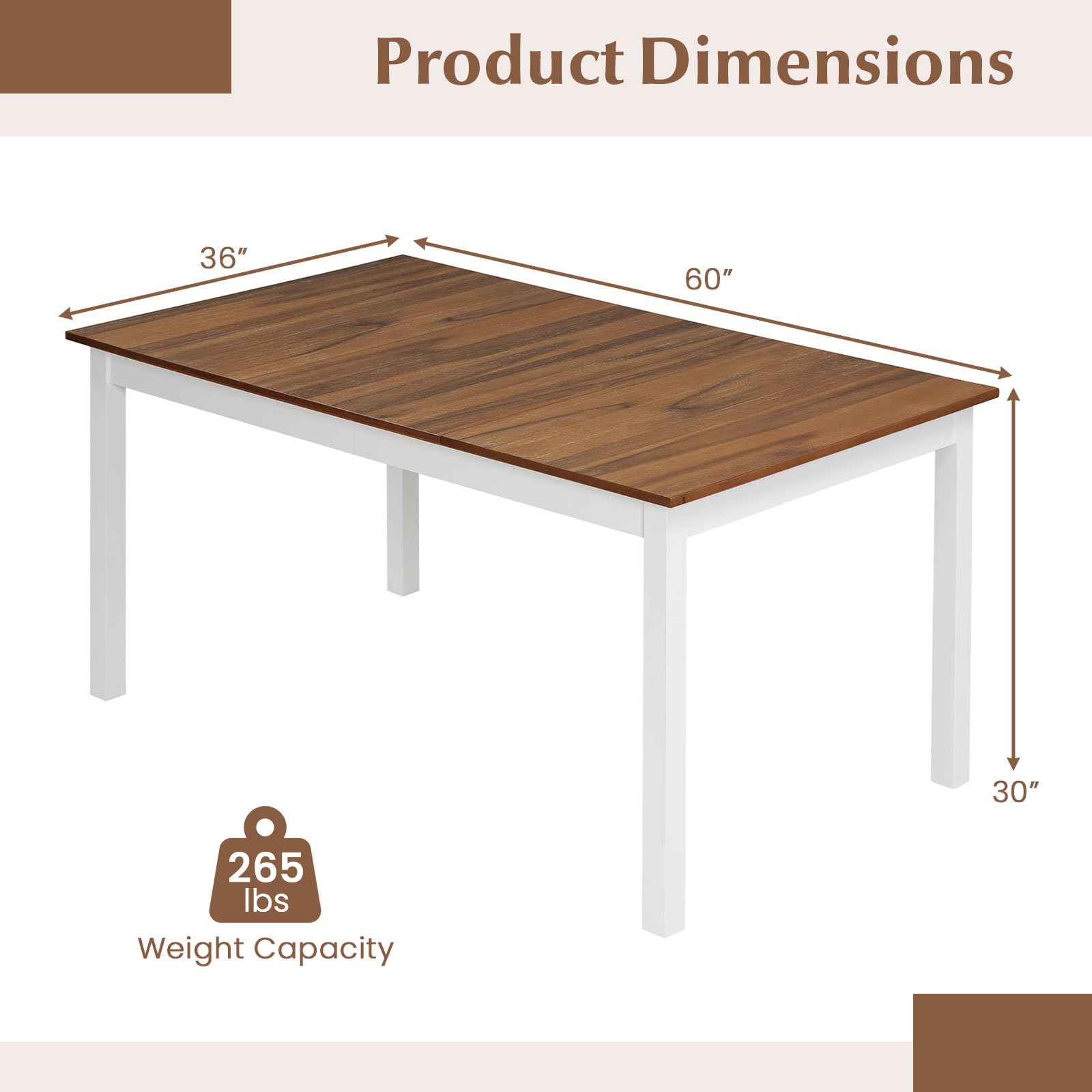 Designed to seat up to 6 people comfortably, this spacious tabletop offers plenty of room for family meals and is easy to clean for everyday convenience. Supported by solid rubber wood legs, the table provides reliable sturdiness for your peace of mind. Reinforced supports and protective foot pads enhance stability while safeguarding your floors. Meanwhile, its classic wooden texture adds warmth and style, making it an ideal fit for kitchen, dining room, living area and even restaurant settings. This versatile piece combines rustic aesthetics with practical construction to create a welcoming centerpiece for your room.