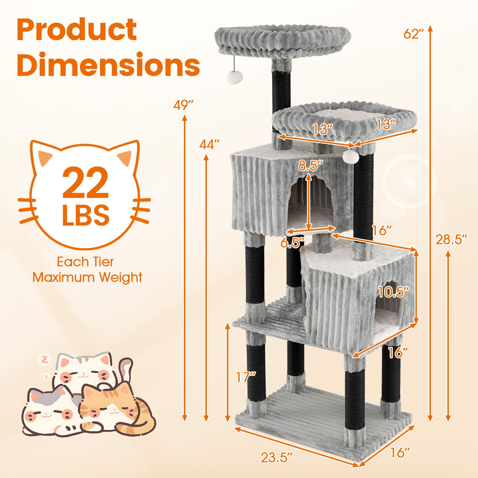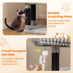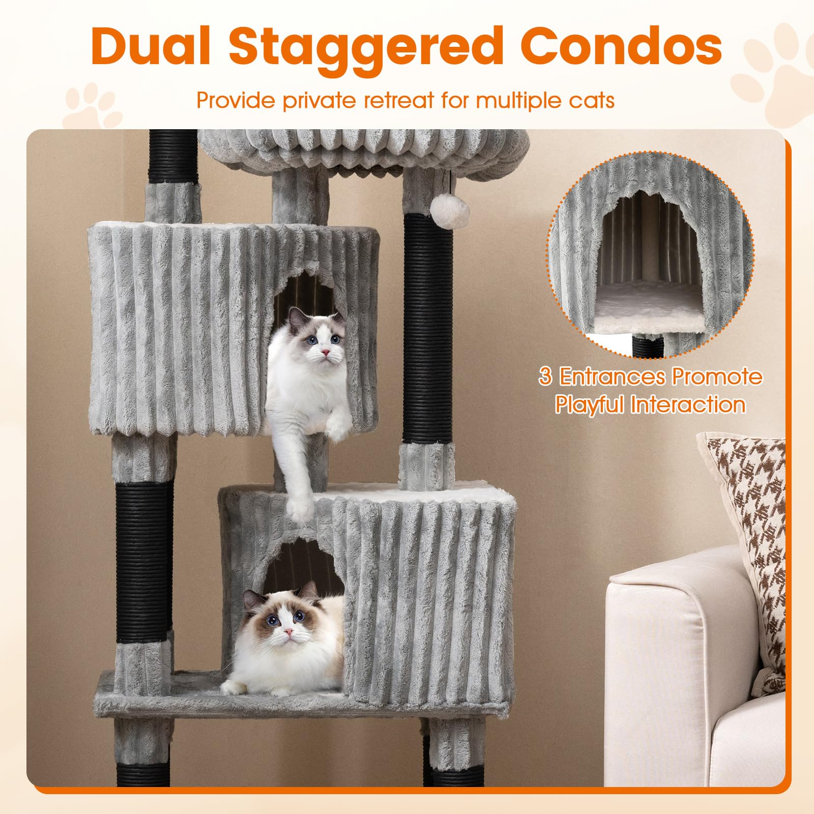 The chic ribbed flannel covering of the large cat tree brings a touch of elegance while creating a warm, inviting environment. 2 elevated perches with soft padding provide ideal vantage points where cats can lounge and observe their surroundings. Plus, each perch bed is detachable and washable for simple upkeep. For households with multiple cats, 2 staggered condos with 3 entrances promote playful interaction. The perch beds and condos feature warm faux rabbit fur linen, delivering extra comfort. Additionally, the 2 plush pompoms with bells invite cats to pounce and bat, thus alleviating their stress. Also, the multi-level cat tower features multiple scratching posts, promoting natural scratching behaviors and safeguarding your furniture from scratches. Moreover, a wide base ensures stability for the spirited climbers.