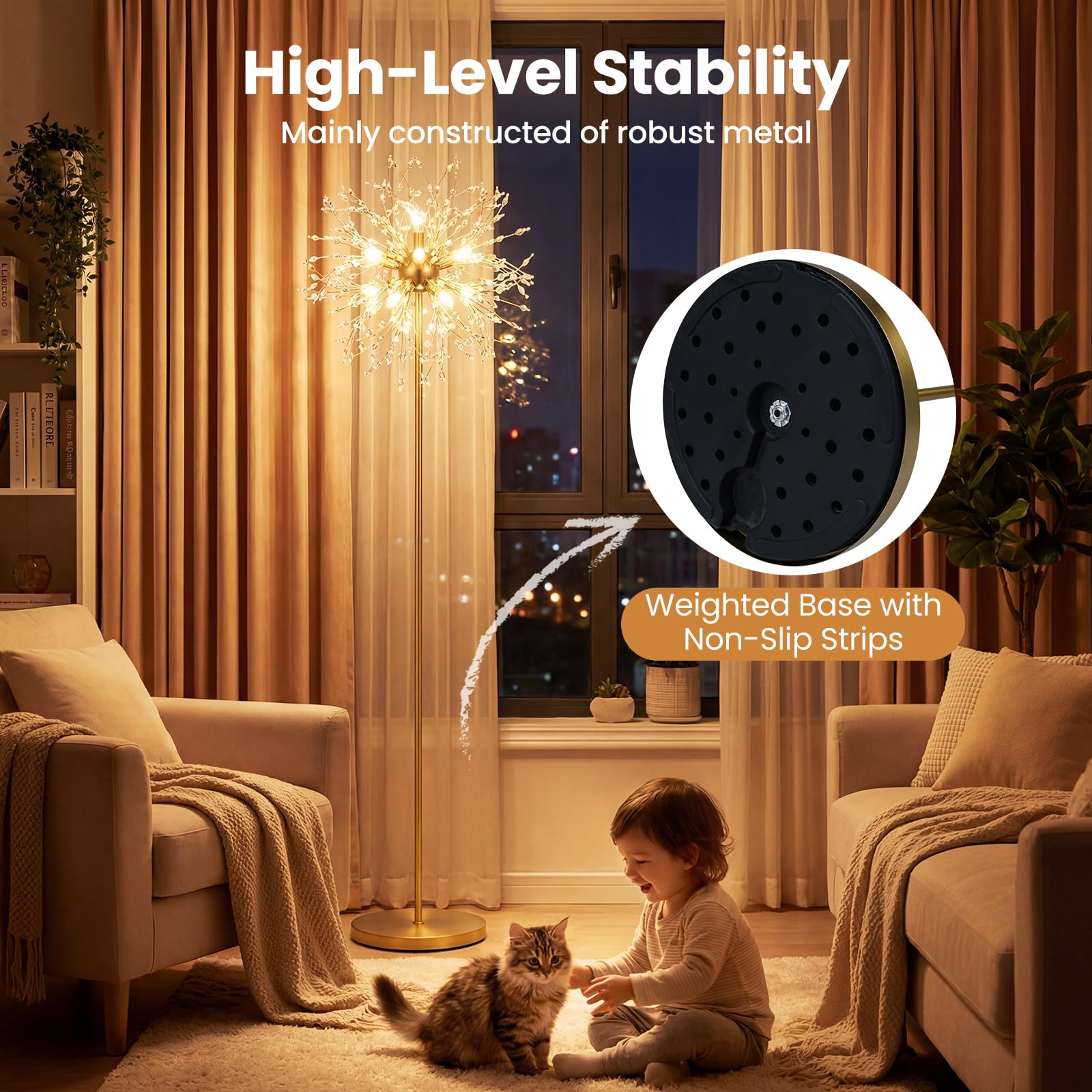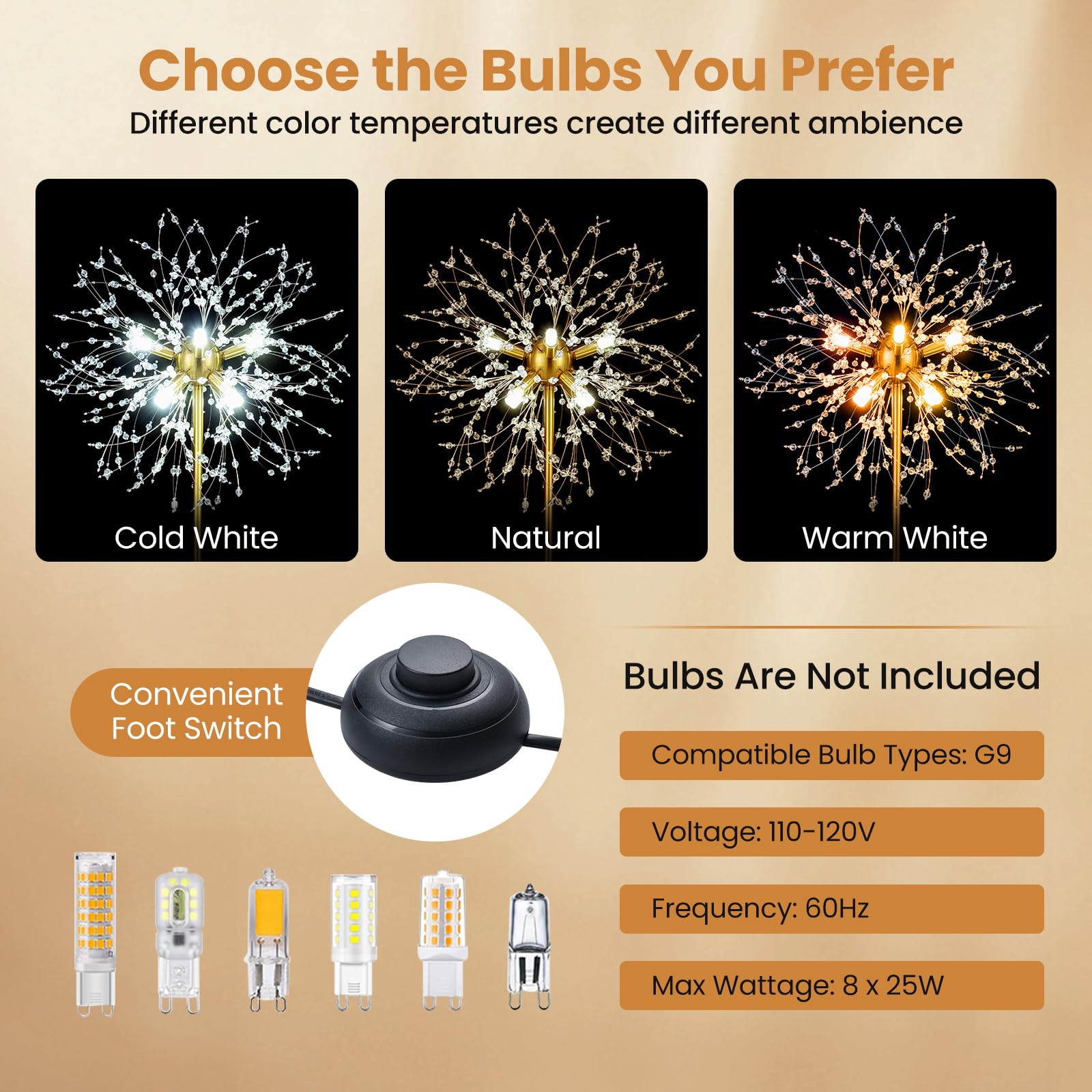 The decorative acrylic crystals scatter light beautifully, offering a warm, multidirectional glow. Designed to accommodate 8 G9 bulbs (not included), you can customize the ambiance with your preferred light temperatures such as cold white, natural and warm white. The sturdy metal construction and weighted base provide exceptional stability, while a convenient foot switch and 6.9 ft power cord offer effortless control and flexible placement. This modern floor lamp is the perfect blend of style and function for living room or office environment.