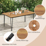 Featuring a large tabletop made of robust acacia wood with waterproof painting, this rectangular dining table is built to last to withstand daily use. Ideal for patios, decks, and even indoor places, the dining table is suitable for a small gathering of 6 people. In addition, the sturdy metal supporting legs make sure the patio table can hold up to 330 lbs, while the adjustable foot pads ensure stability on uneven surfaces. Importantly, there is a central umbrella hole to fit most patio umbrellas, providing shade on sunny days, including a hole cover when the umbrella is not required.