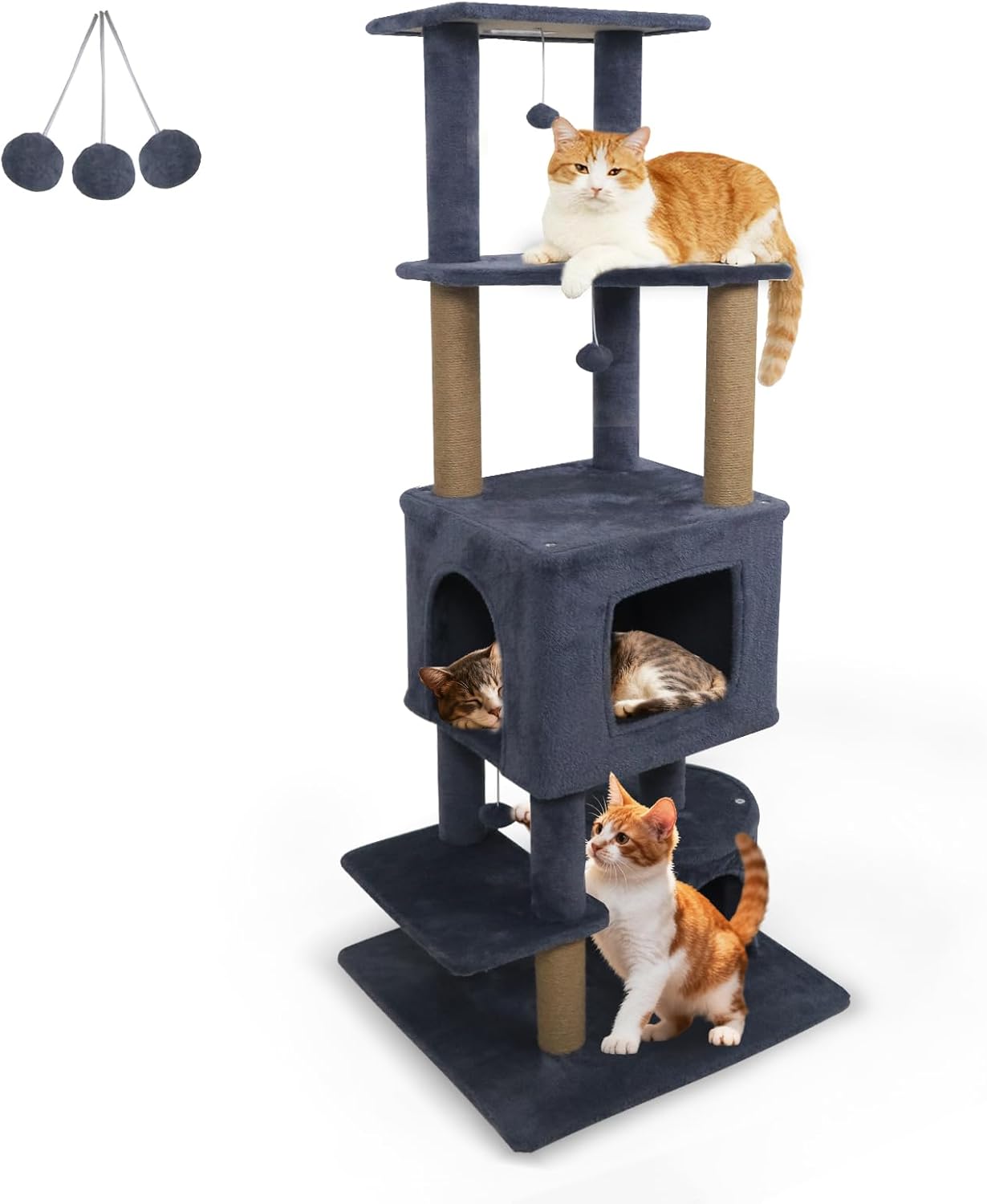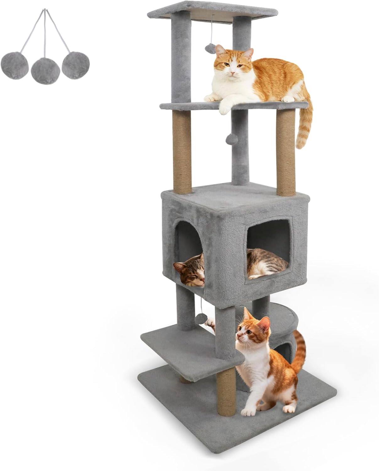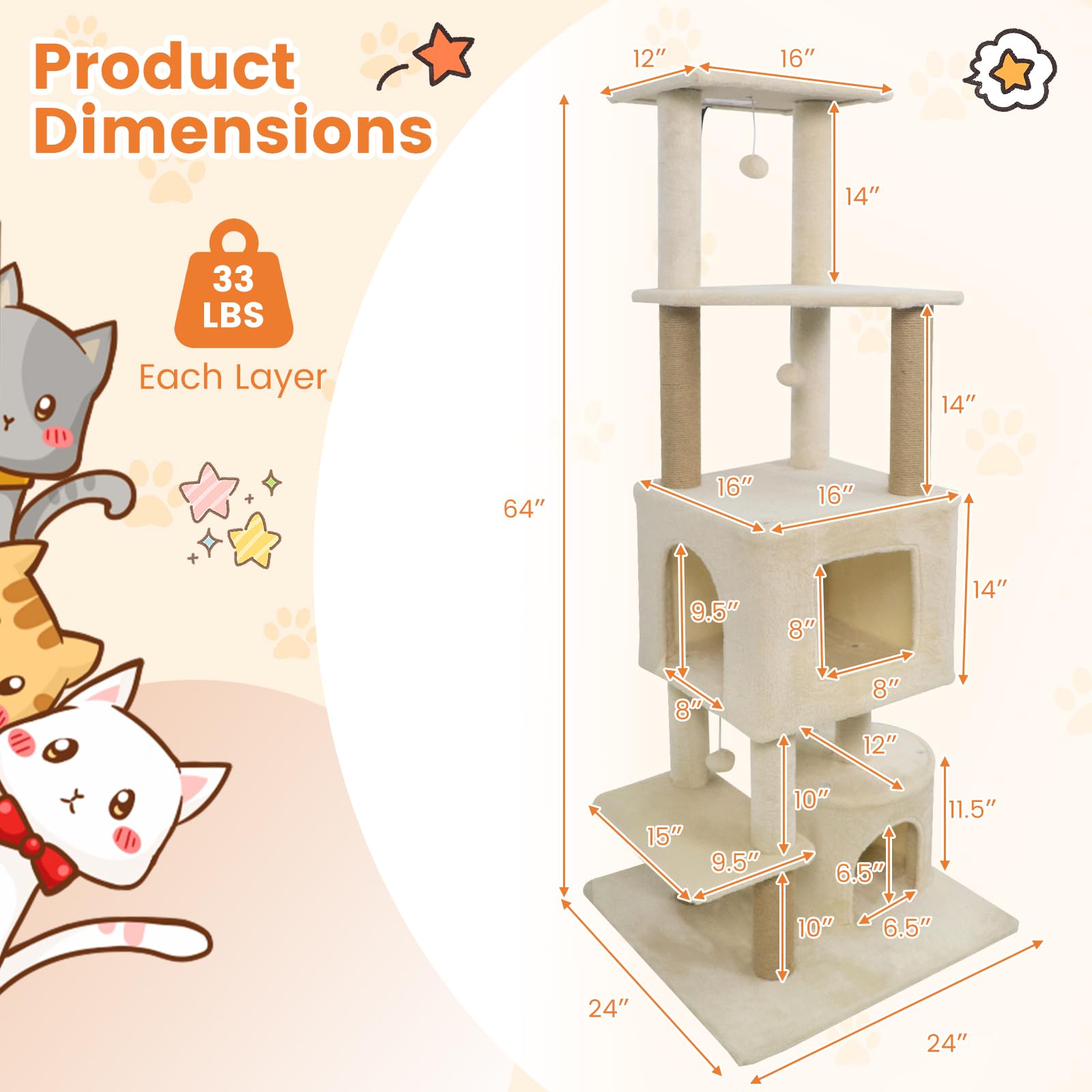 Our multi-level cat tree measures 24” x 24” x 64” (L x W x H), thoughtfully designed for homes with multiple cats. The structure features roomy 2-door and round condos, offering your cats inviting hideaways for restful naps and peaceful solitude. Elevated platforms and a top perch give curious kitties a variety of vantage points to observe their surroundings and lounge in style. Natural jute scratching posts satisfy your cats’ instincts while helping to protect your furniture from unwanted scratches. Built with a reinforced base and an anti-toppling device, this cat tree ensures superior stability and safety for playful climbers and active cats. Every tier is wrapped in soft plush fabric, transforming each level into a soothing sanctuary. With its thoughtful design and reliable materials, this cat tree is an ideal choice for keeping cats happy, healthy, and entertained.
