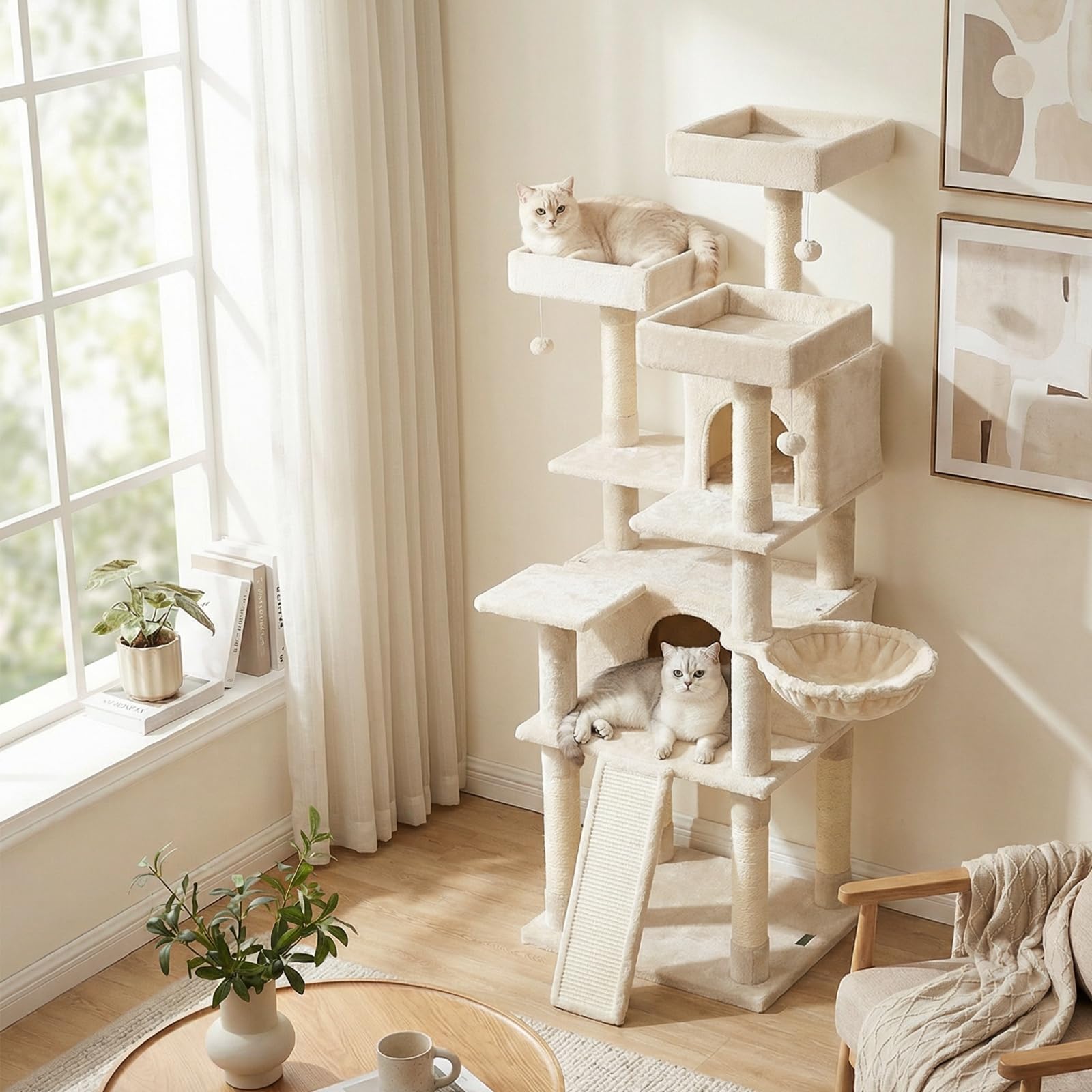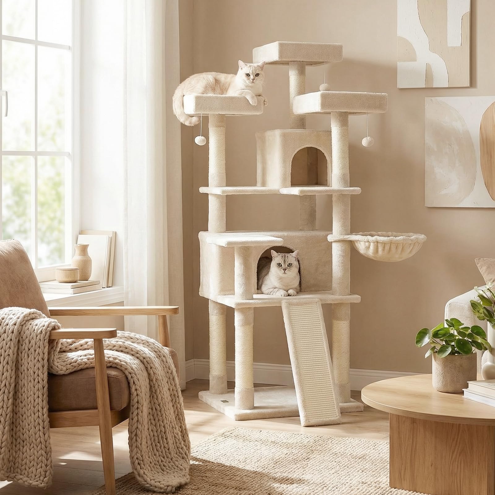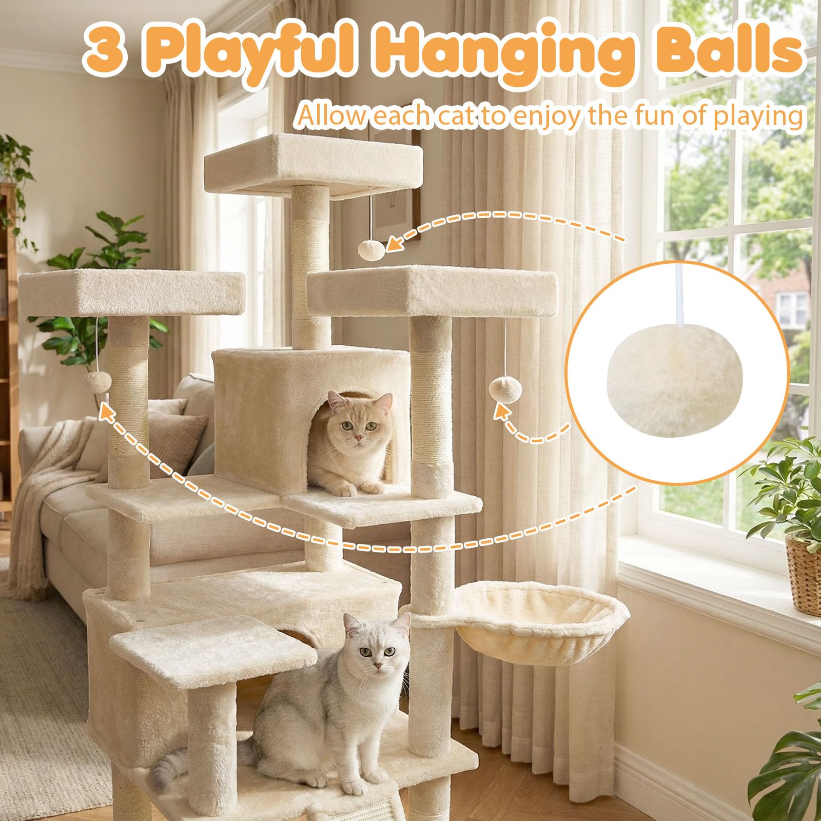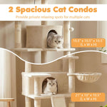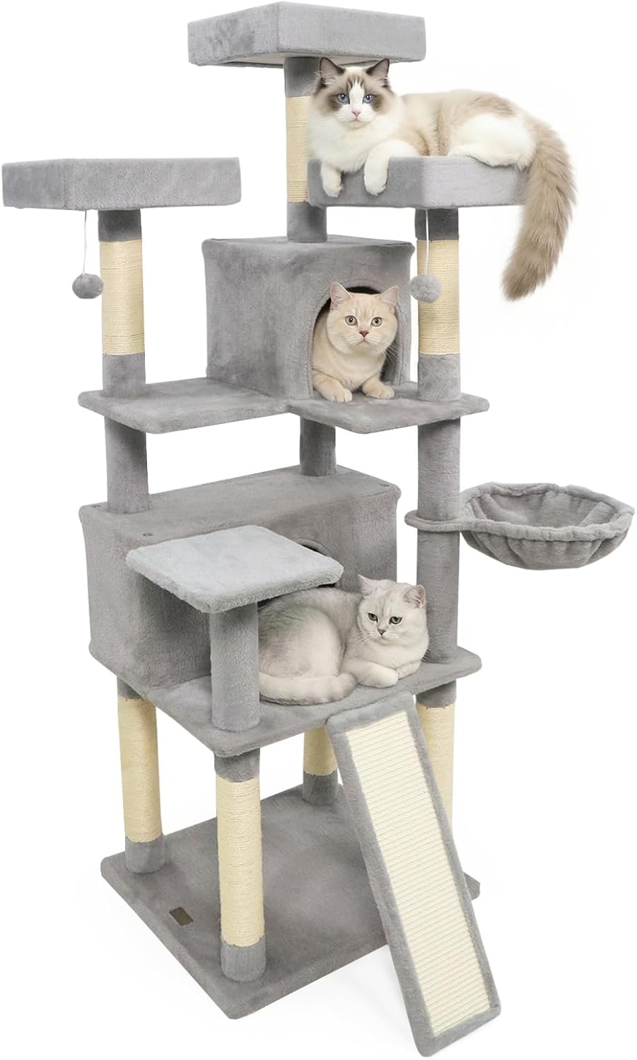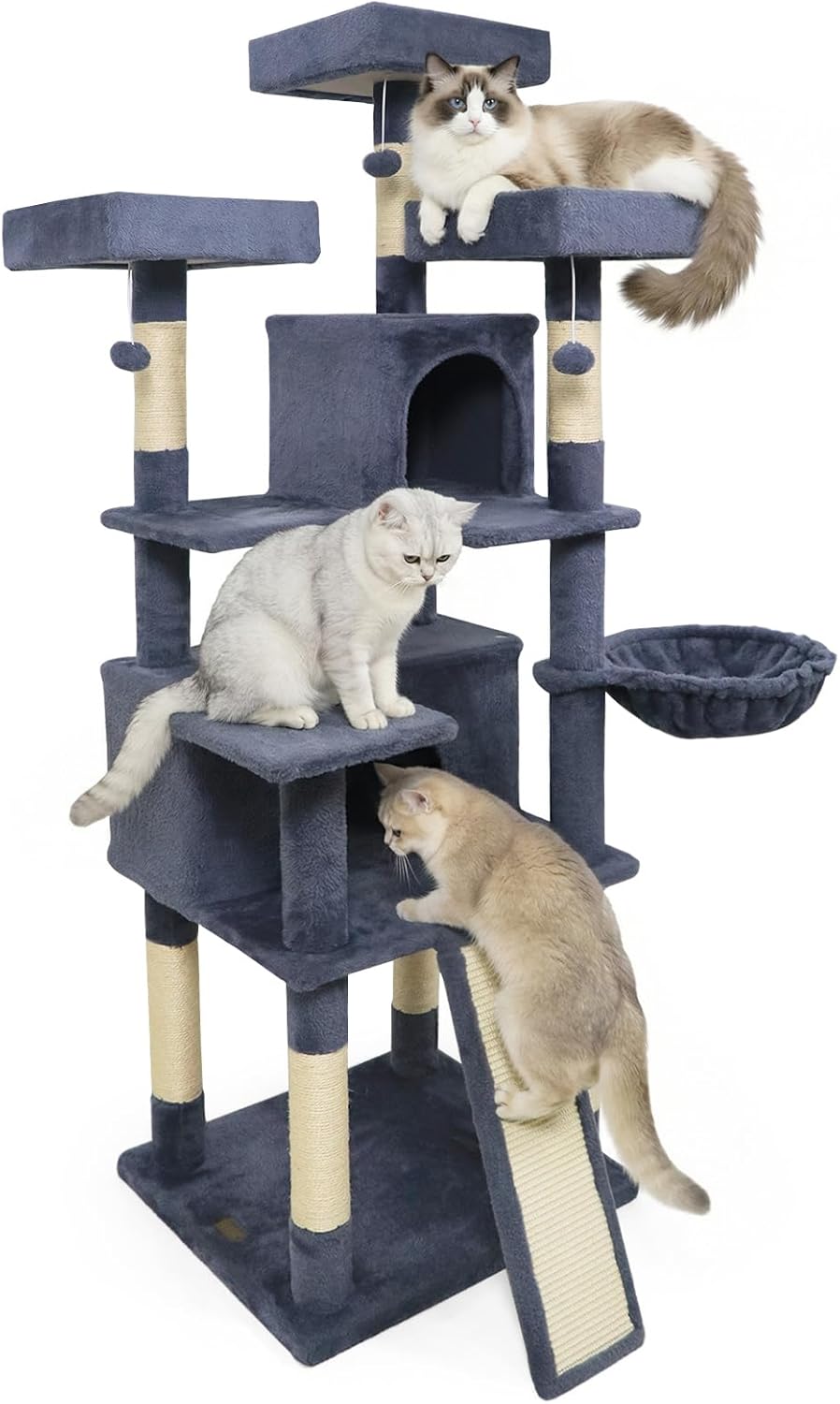 Crafted from high-quality boards and wrapped in soft plush fabric, this cat tower includes 2 spacious cat condos, a comfy basket, and 3 top perches for curious explorers. The 7 natural sisal scratching posts and sturdy sisal scratching board protect your furniture, and the wide base ensures stability and safety during climbing and jumping. In addition, with 3 hanging plush balls, this cat playhouse is both functional and stylish, making it a perfect addition to cat lover's home.
