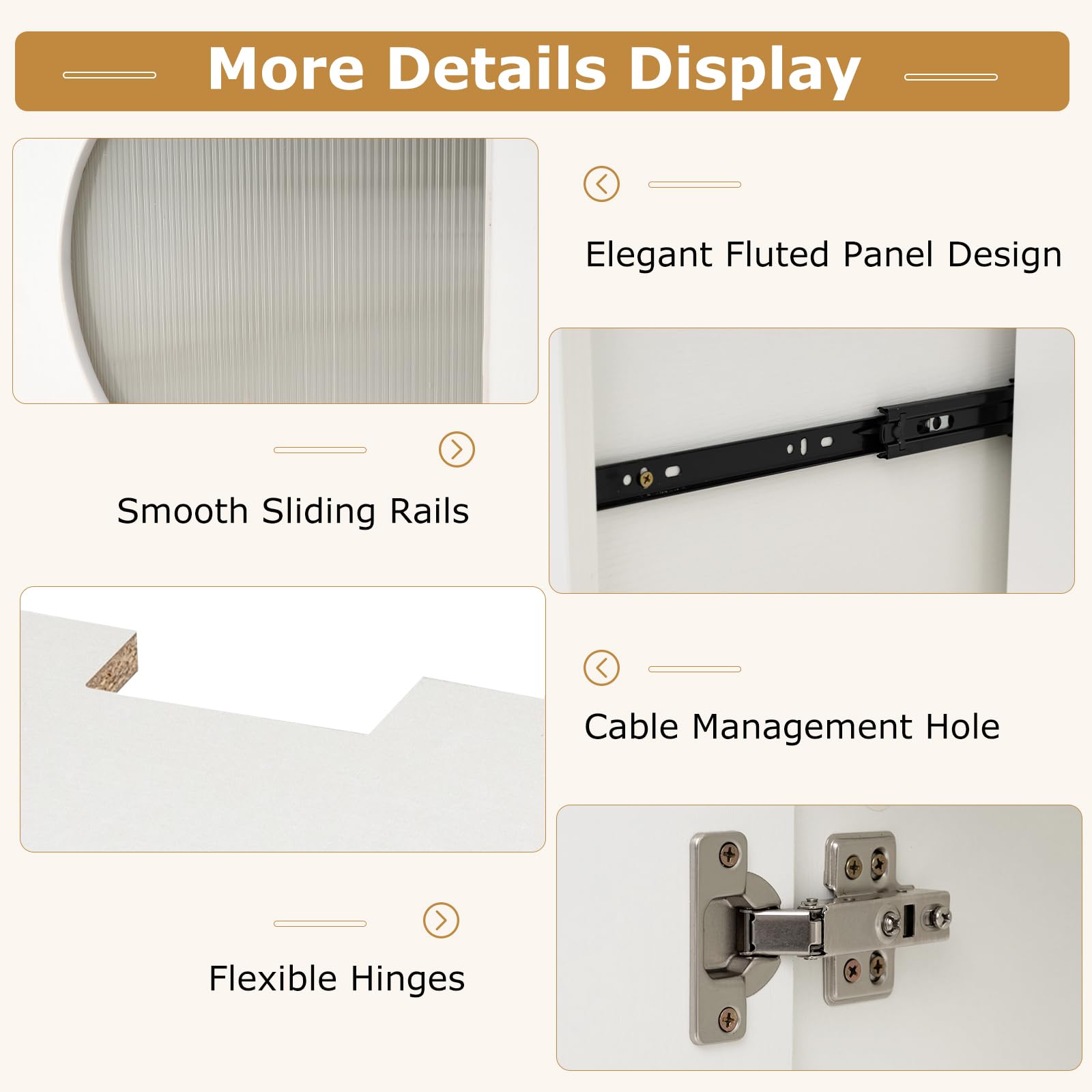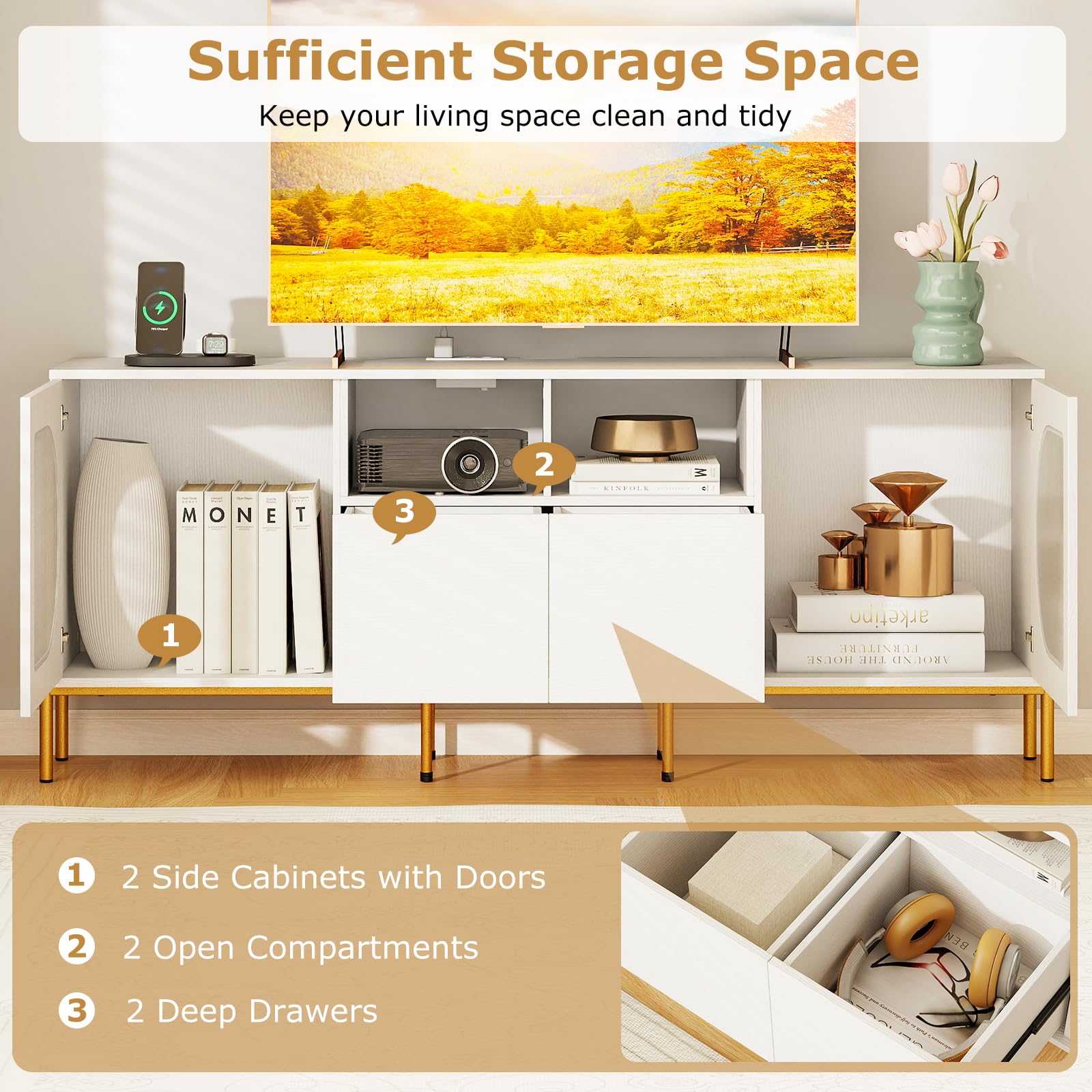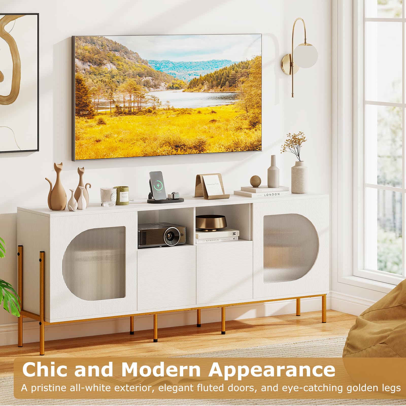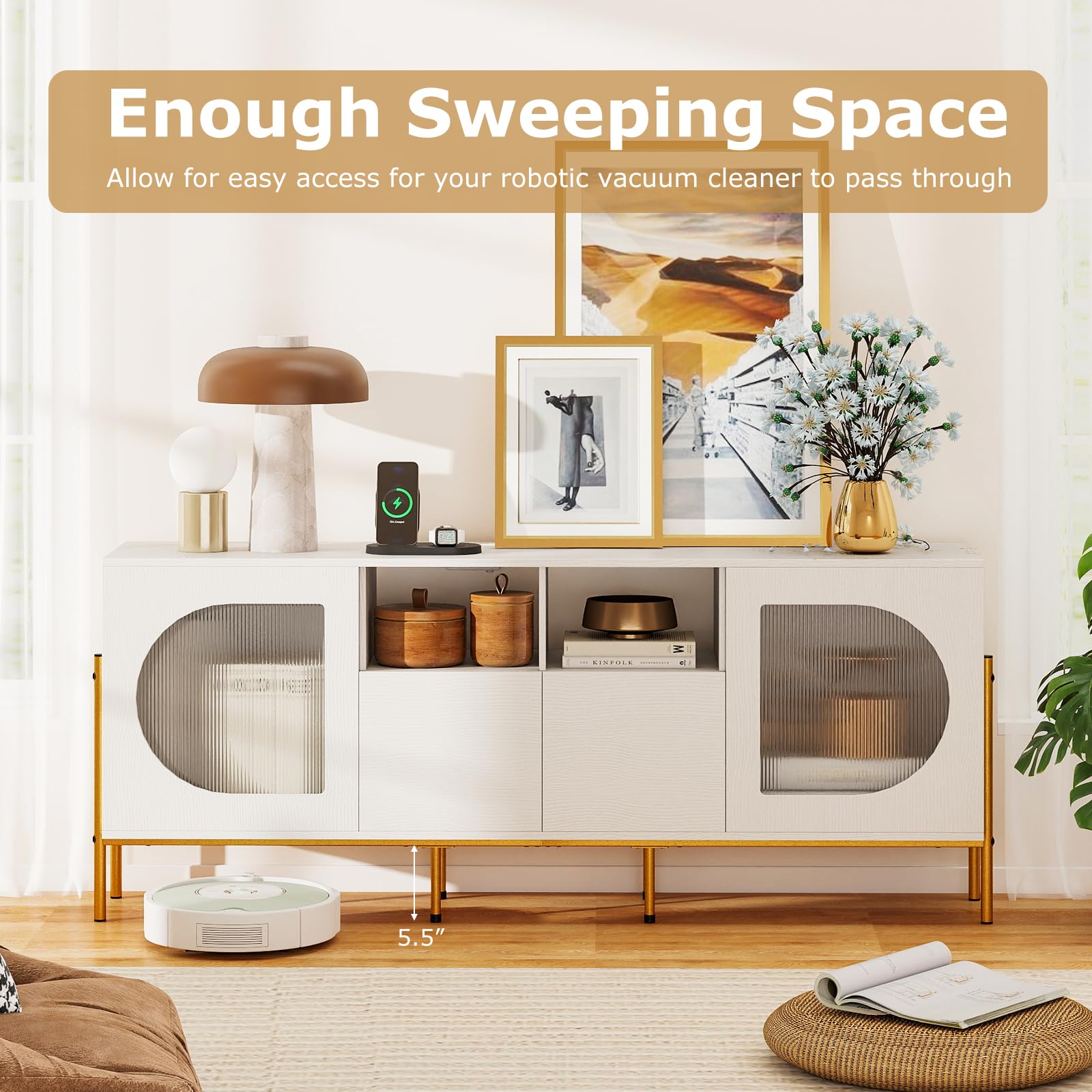 Our wooden TV stand combines elegant design with practical technology, making it an ideal centerpiece for contemporary living spaces. With a built-in power strip offering both traditional and fast-charging ports, powering multiple devices is effortless and tidy. Its thoughtfully designed storage - spacious cabinets, deep drawers, and open shelves - helps you keep media accessories and decorations organized without clutter. Supported by 8 sturdy metal legs with adjustable pads, this TV stand remains stable even with larger televisions. A smooth, easy-clean surface and a cable management system keep your setup streamlined, while the generous clearance below ensures cleaning robots can reach every corner. Finished in crisp white with stylish fluted panels and elegant golden legs, this stand blends seamlessly into living rooms, bedrooms, or offices, and accommodates TVs up to 70”, offering both function and sophistication for any modern home.