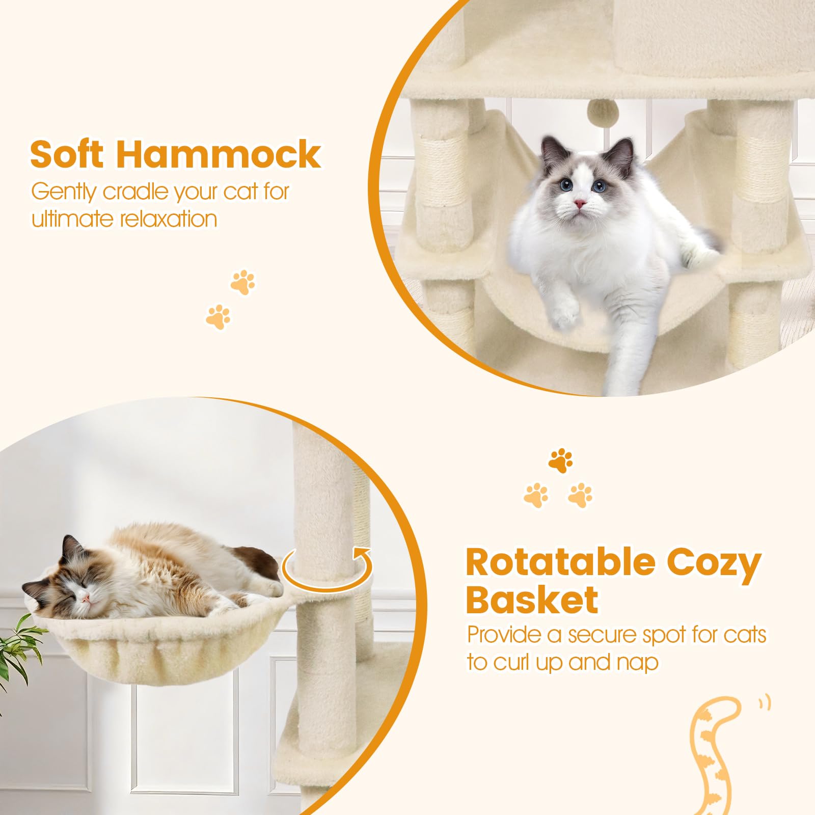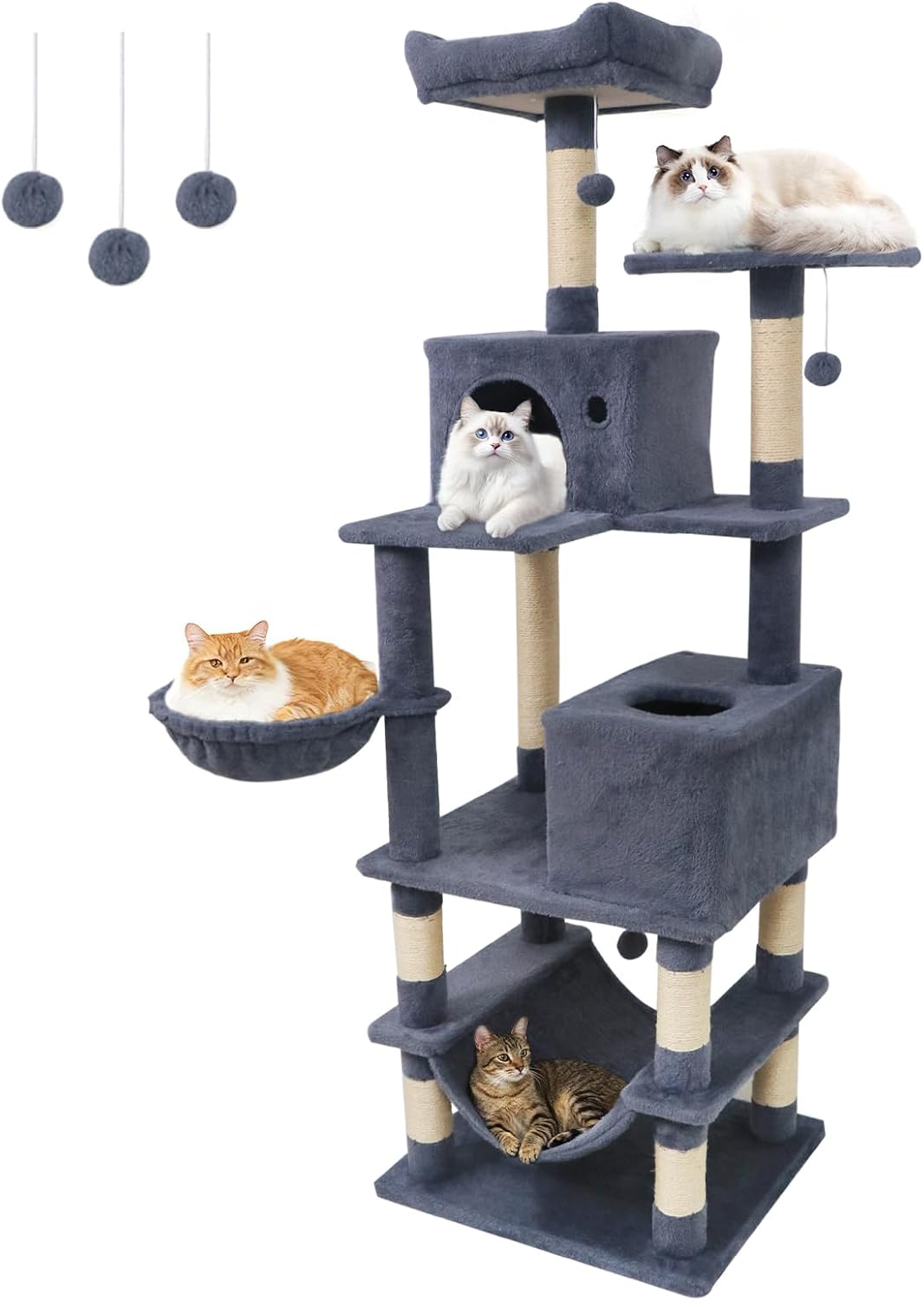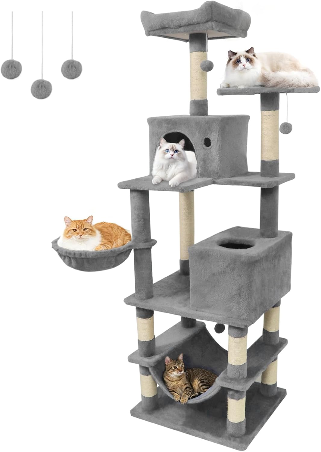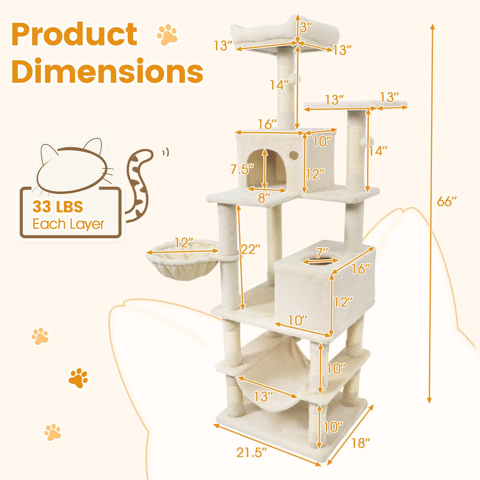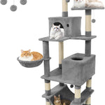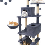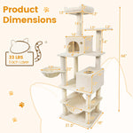 Our multi-level cat tree measures 21.5” x 18” x 66”(L x W x H), thoughtfully designed for homes with multiple cats. It offers a variety of elevated lounging areas, roomy condos, and unique resting options like a soft hammock and a cozy basket. Multiple built-in scratching posts and hanging toys support your cats’ playful and natural instincts, helping to keep them active and entertained throughout the day. Constructed with a wide, sturdy base and equipped with an anti-toppling device, this cat tree ensures stability and peace of mind, even during group play. Each tier is padded with plush, soft fabric and finished with reliable natural sisal, providing comfort and safety at every level. With plenty of platforms and hideouts, this cat tree gives every cat a special spot to climb, relax, and call their own.