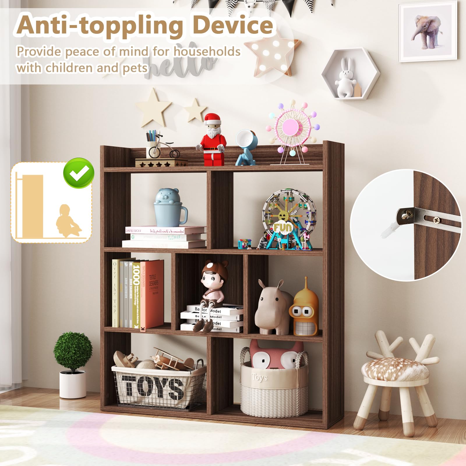 This bookshelf not only offers diverse storage options with its 7 uniquely sized cubes but also features a safety-conscious anti-toppling device, ensuring it stands securely in your living room, bedroom, kid’s room or office. The additional top open shelf is cleverly designed with 3-sided raised edges to safeguard and artistically display your cherished items, blending functionality with sophisticated style in 1 versatile unit.