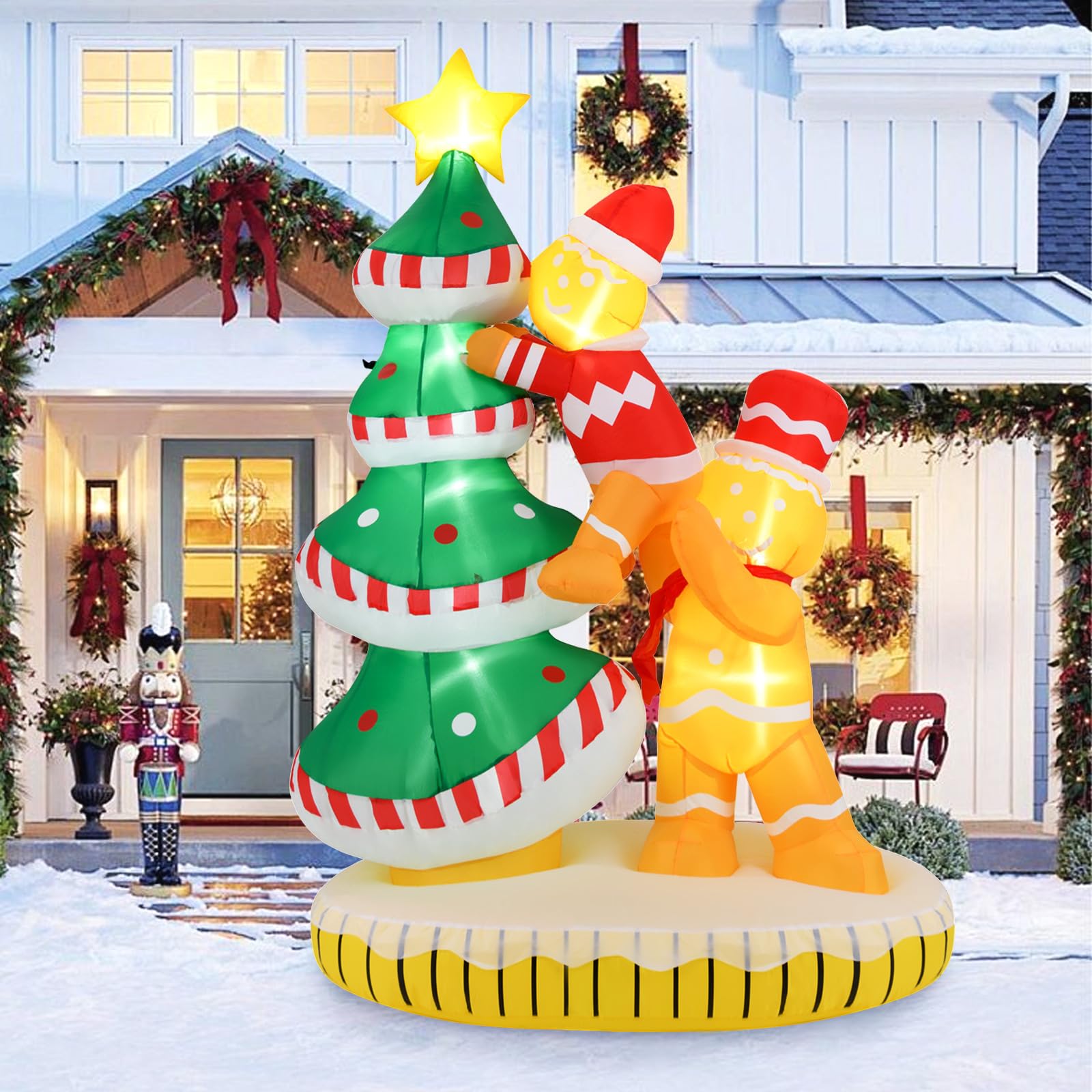 - Gingerbread Men & Tree Combo: This 7 ft tall inflatable Christmas decoration showcases that 2 Gingerbread men try to climb up the Christmas tree, bringing a sense of festive atmosphere and making the surroundings alive. The star of Bethlehem on the top adds more elegance.