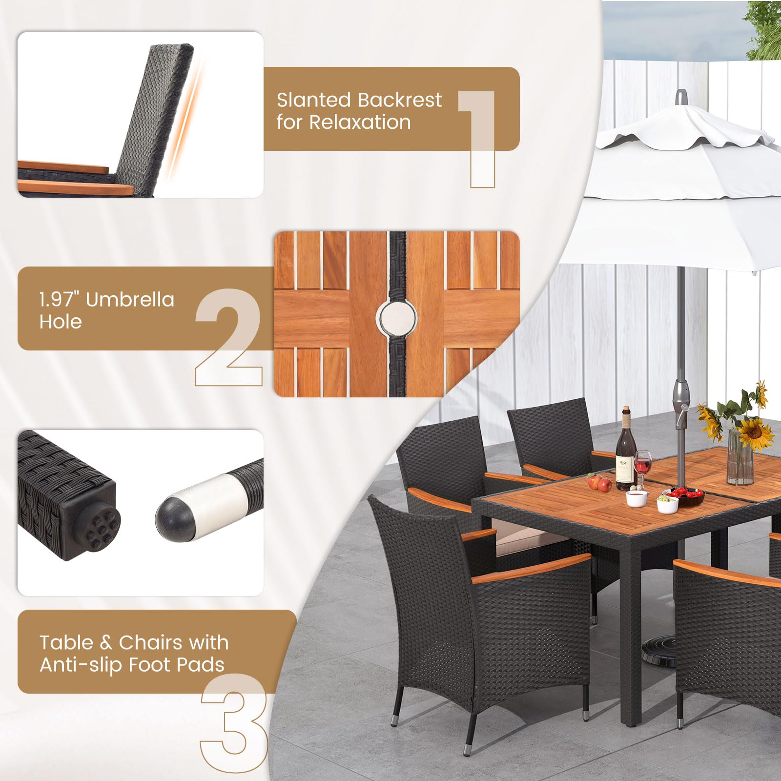 - Exquisitely Crafted Large Table: Equipped with a 59” x 36” large dining table and 6 rattan chairs, the outdoor dining set can comfortably accommodate 6 people. And the 1.97" umbrella hole is ready to perfectly secure your patio umbrella.