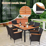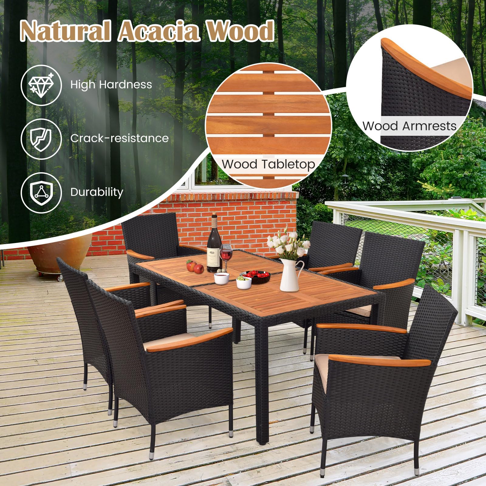 The 7 pieces outdoor dining set is designed to accommodate a party of 6. The centerpiece is the wood tabletop, which is made of natural acacia wood to bring elegant touch to your outdoor space and ensure durability. With a convenient 1.97” umbrella hole, you can easily provide shade when needed. The chairs are mainly constructed of PE rattan, which is breathable and easy-to-maintain, ensuring impeccable beauty in the face of changing weather conditions. And each chair is equipped with a non-woven fabric covered cushion, which is filled with sponge to soothe your fatigue and reduce pressure. And the cushions feature zipper cover for easy cleaning. Moreover, the inclined backrests and built-in armrests will offer unparalleled comfort as you dine. Furthermore, the dining set is reinforced by robust metal pipes that guarantees strength. To ensure higher stability, the outdoor conversation set comes with adjustable pads and non-slip pads, allowing you to enjoy your meals without any concerns.