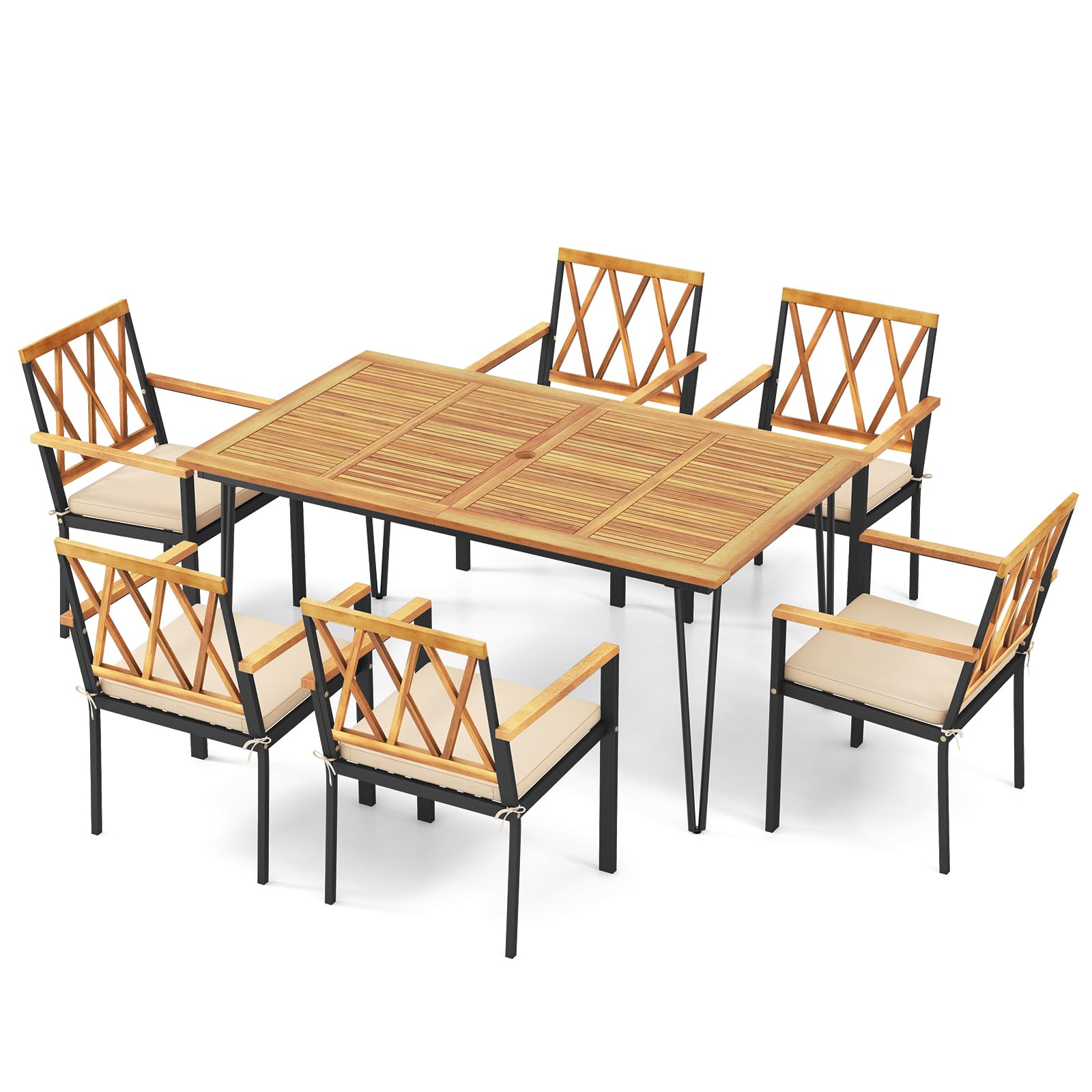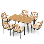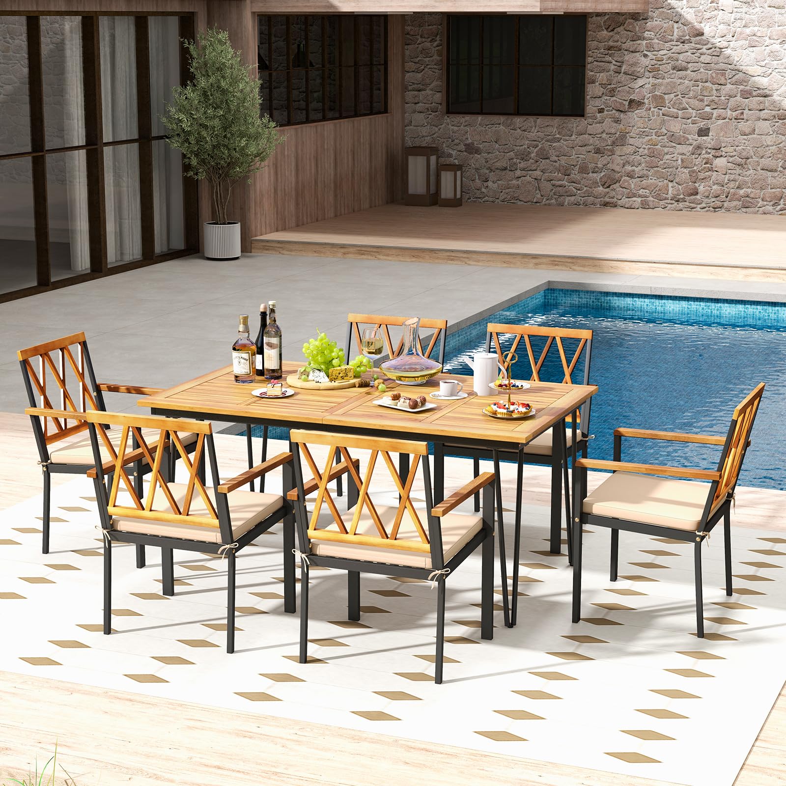 - Suitable for Various Settings: This 7-piece patio dining table and chairs set is a versatile choice for any outdoor and indoor space. The acacia wood endows the dining set with natural charm and timeless beauty, ideal for patios, gardens, poolside areas, or backyards.