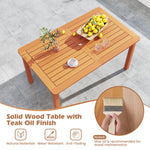 Ideal for Sunday brunches under the sun, lazy afternoon lemonades by the pool, or weekend pizza nights with friends, the outdoor table set comfortably seats six, with a 2" umbrella hole for adding a patio umbrella when needed. The 105° reclined backrests and wide armrests of the chairs make long dinners comfortable, while its slatted design keeps you cool during summer events. Made from solid wood and treated with teak oil, the set naturally enhances your outdoor space, whether placed on your deck, patio, or garden. DIY it with your creative ideas, and let the good times roll!