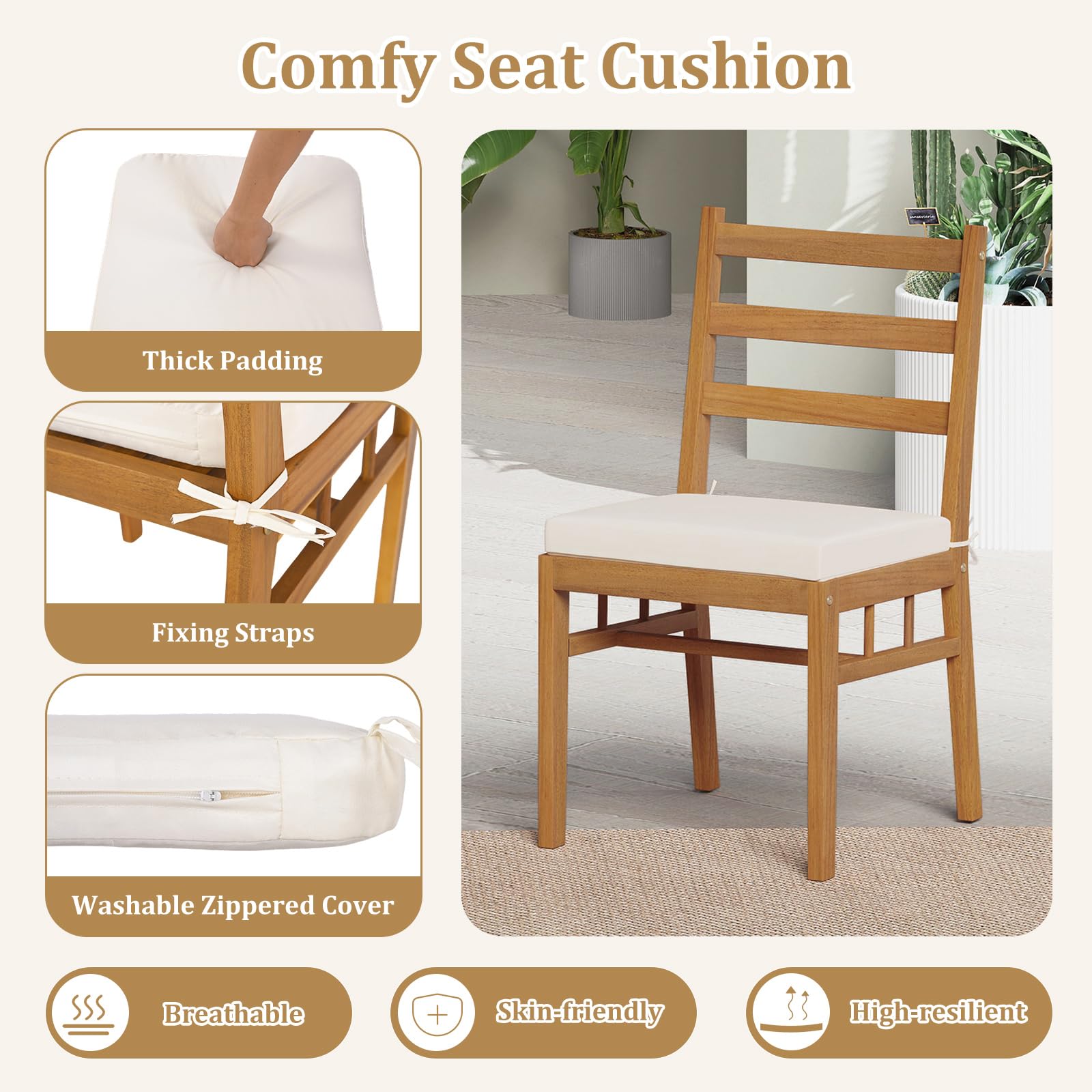 The soft cushions and curved backrests make this outdoor table and chairs set feel comfortable and ergonomic, while the reinforced acacia frame quietly supports up to 400 lb per seat and 165 lb for the table. A pre-drilled 1.97-inch umbrella hole crowns the spacious rectangular top of this patio table set, inviting shade on demand. Additionally, the timeless silhouette of the acacia wood patio furniture set slips seamlessly from poolside to garden to deck without ever looking out of place.
