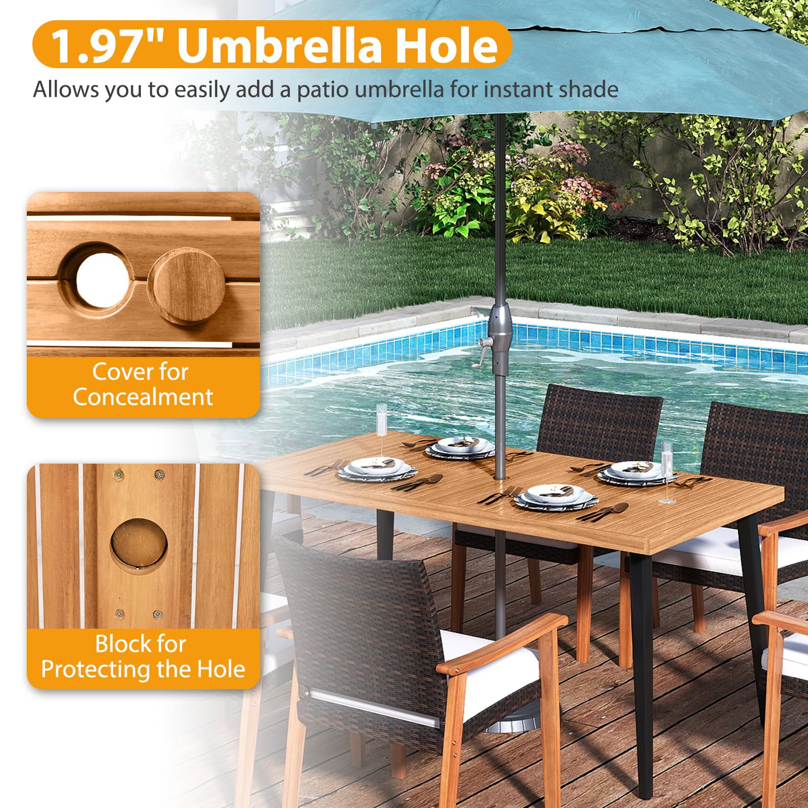 1.97”/5 cm umbrella hole allows you to easily add a patio umbrella for instant shade