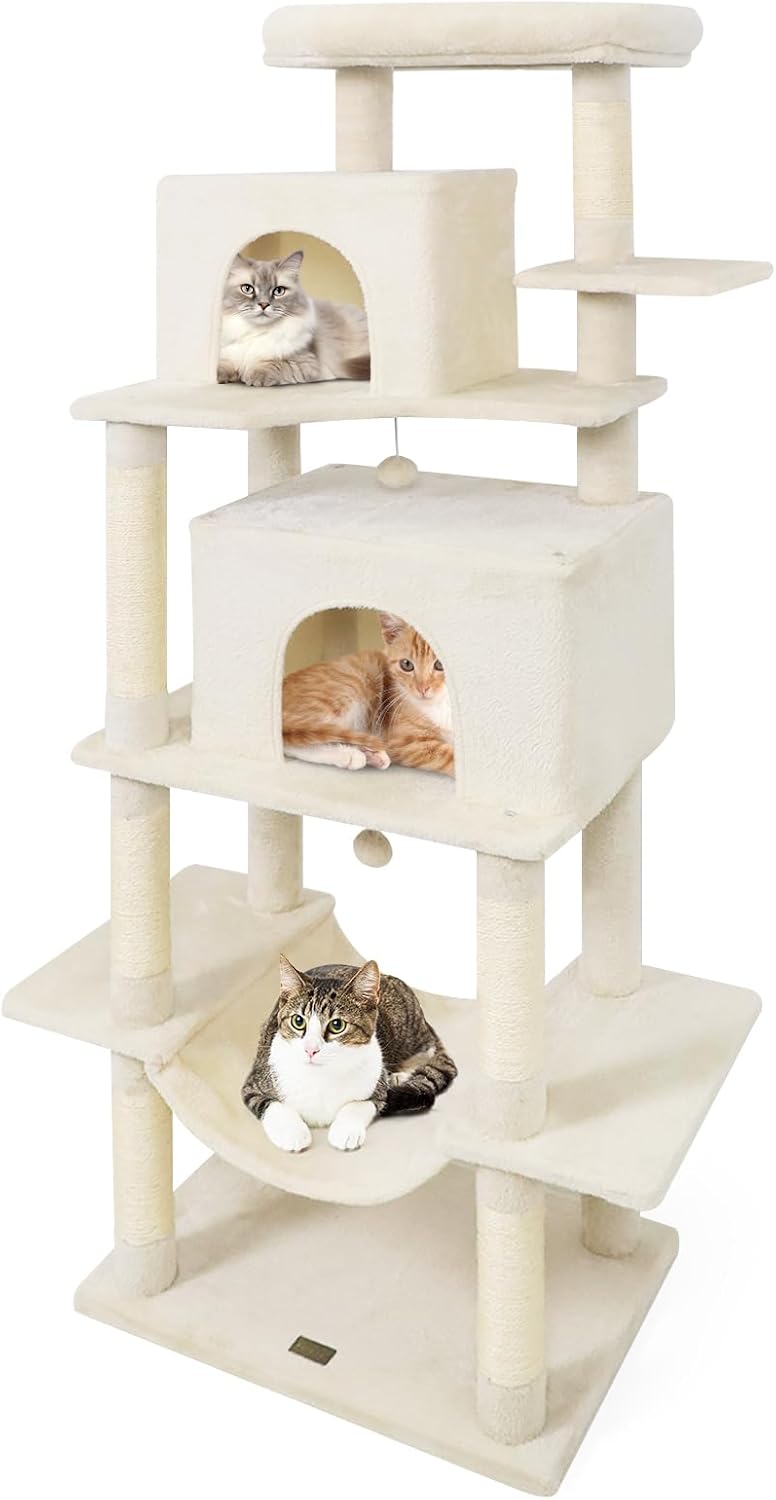 Ideal for homes with more than one cat, the cat tower with double condos provide ample private space for quiet naps and relaxation. The elevated top perch caters to your cat's love for high vantage points, while multiple platforms encourage climbing, jumping, and healthy play. For added comfort, a cozy hammock gently rocks your cats, offering a soothing escape. Additionally, the sisal scratching posts satisfy their instinctive clawing needs, protecting your furniture at the same time. Furthermore, engaging dangling plush balls spark curiosity and help keep your cats agile and entertained for hours. Designed for safety, the sturdy base and included anti-tipping kit ensure excellent stability. Wrapped in ultra-soft plush, the cat climbing stand creates an inviting activity center for cats.