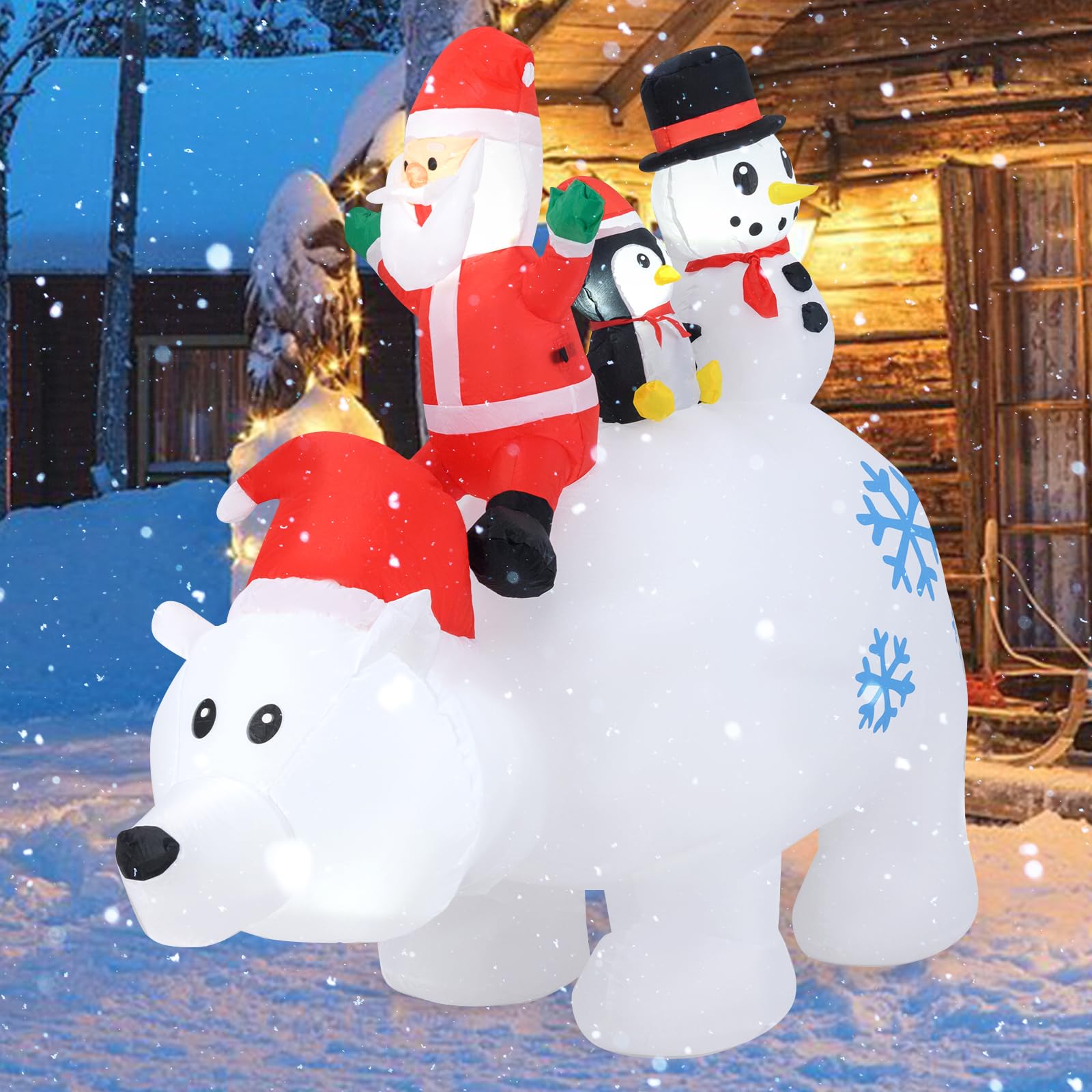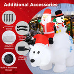 - Cute Appearance: Perched on the majestic polar bear are an assembly of beloved Christmas characters, including Santa Claus, a cheerful snowman, and a cute penguin. Perfect for outdoor yard displays or indoor parties, this inflatable scene brings a whimsical touch to any holiday setting.