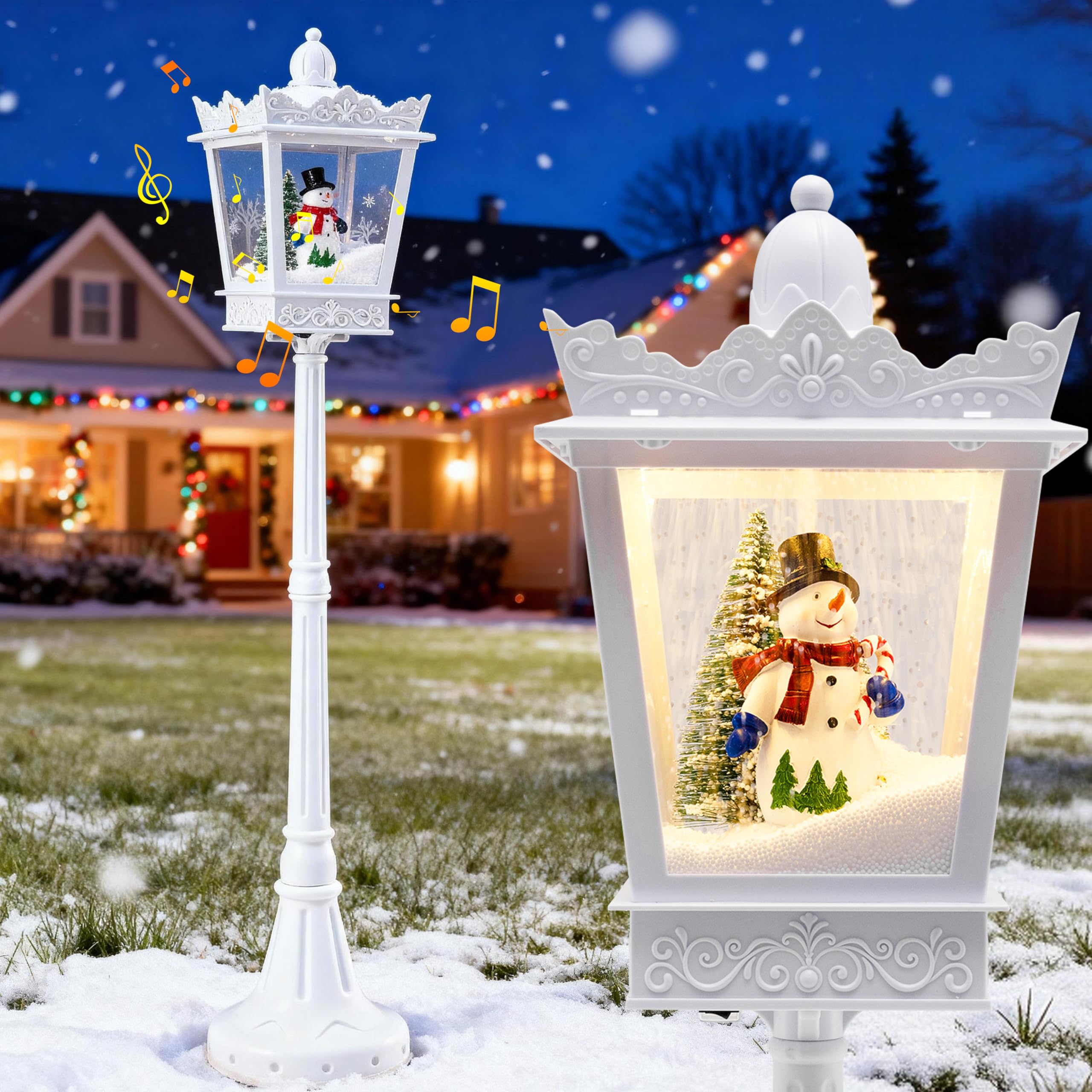 Featuring a vivid santa scene complemented by a festive bow and wreath, the Xmas post lamp instantly elevates any space. The charming signpost with a holiday song title will invite you to a memorable celebration. Moreover, the Christmas street lantern offers 3 versatile modes easily selected with a switch: off, snowing with light, or snowing with light and music. The snowy effect paired with warm white glow mesmerizes your guests, and the music(let it snow) adds a charming touch of nostalgia. Designed with a fillable base, the lighted post lantern is less prone to tip over and is perfect for both indoor and outdoor. Moreover, the Xmas decoration perfectly combines visual appeal with sensory joy, making it a favorite holiday piece wherever it is displayed., including home, front porch or yard. Additionally, assembly is quick and easy with the simple structure.