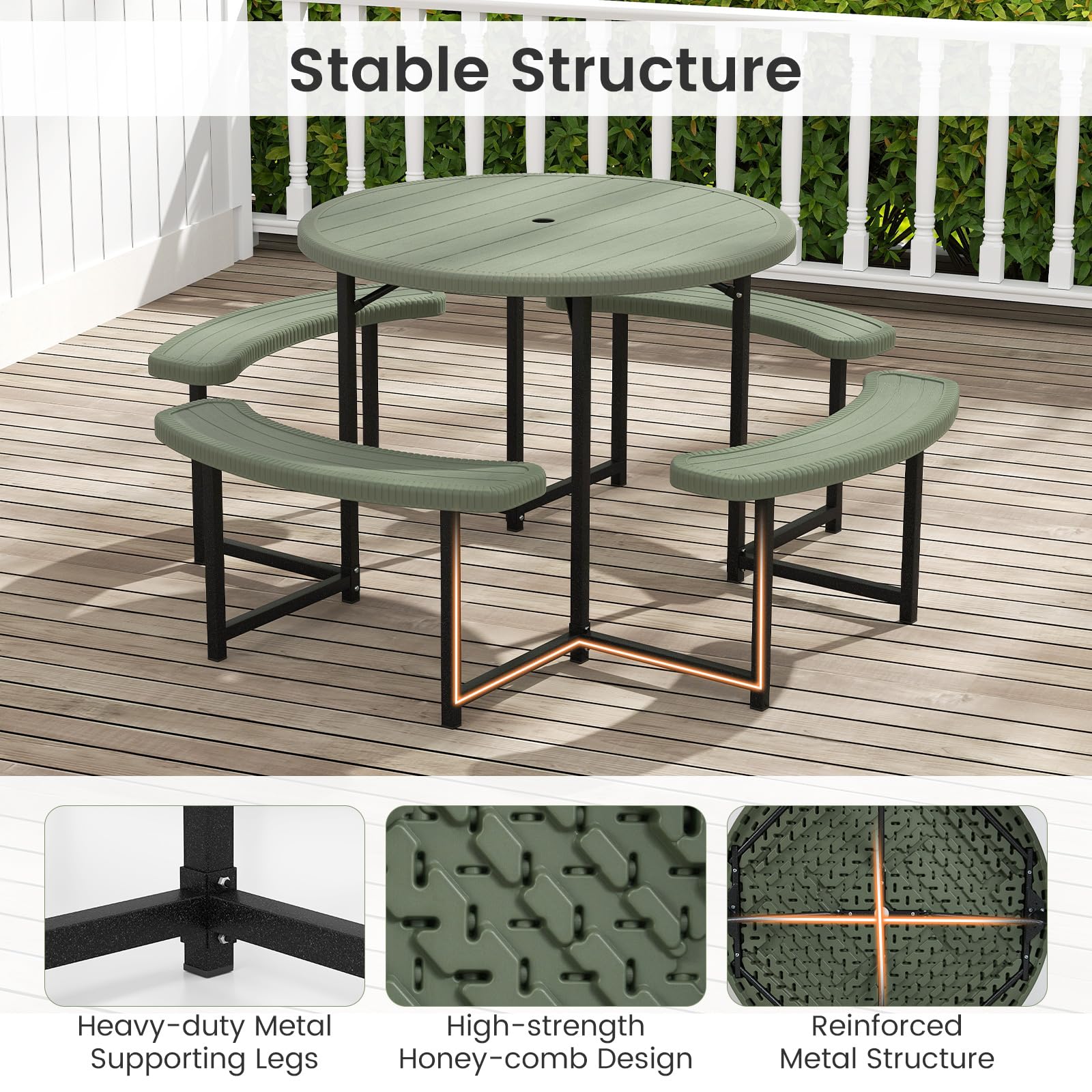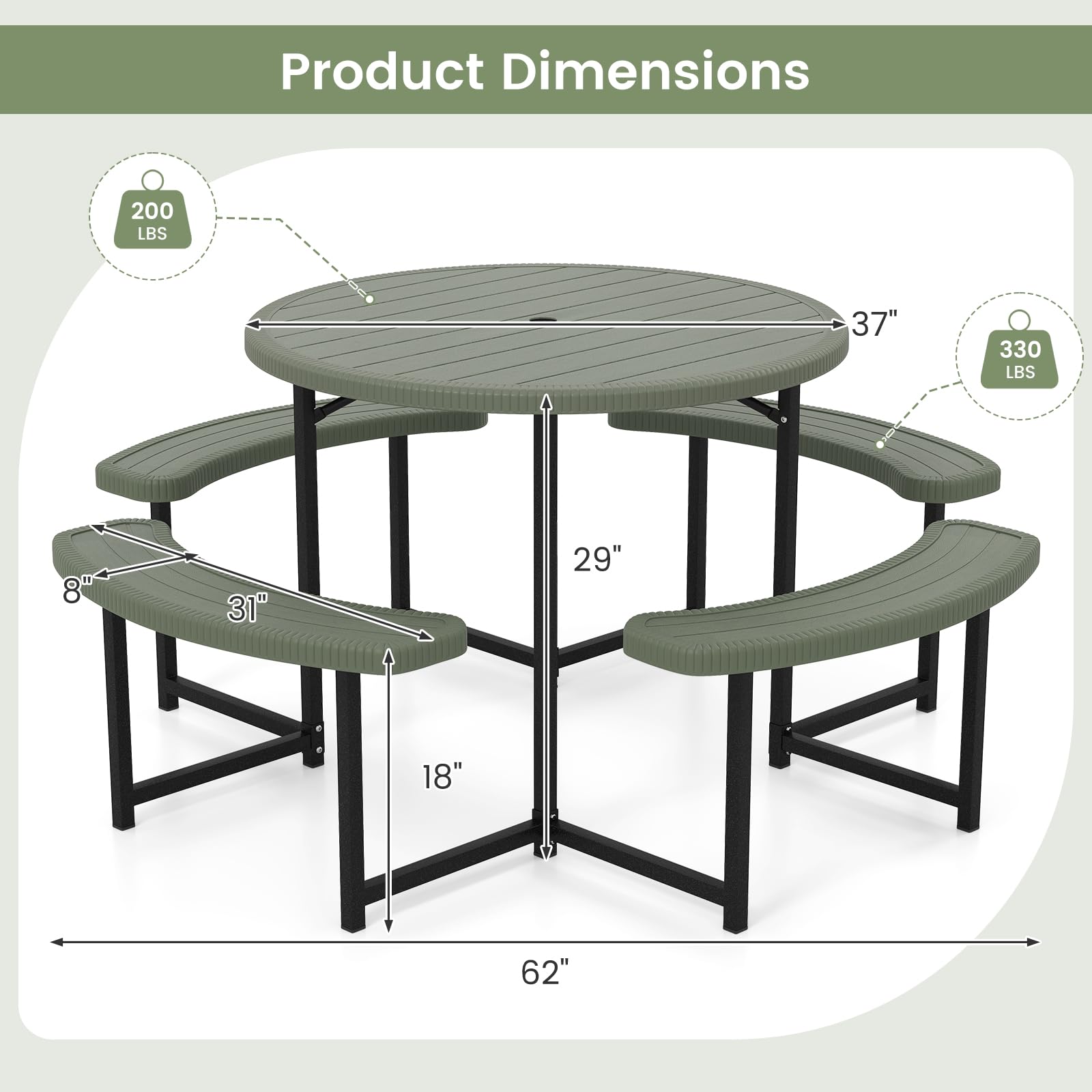With a spacious tabletop and 4 curved benches, the picnic table bench set can comfortably accommodate between 4 to 8 people, making it an ideal choice for picnics, barbecues, or outdoor parties. Additionally, the central hole in the tabletop allows you to easily install a patio umbrella, providing shade and protection from the sun. Unlike others with wood material, ours features a high-quality HDPE tabletop that is both waterproof and not easy to crack, ensuring long-lasting durability. The powder-coated metal frame with non-slip pads provides exceptional stability. Featuring realistic wood grain and shell texture, the outdoor table with 4 seats will elevate your outdoor space. Whether you place it on your lawn, yard, deck, or poolside, the versatile set is perfect for a variety of occasions.