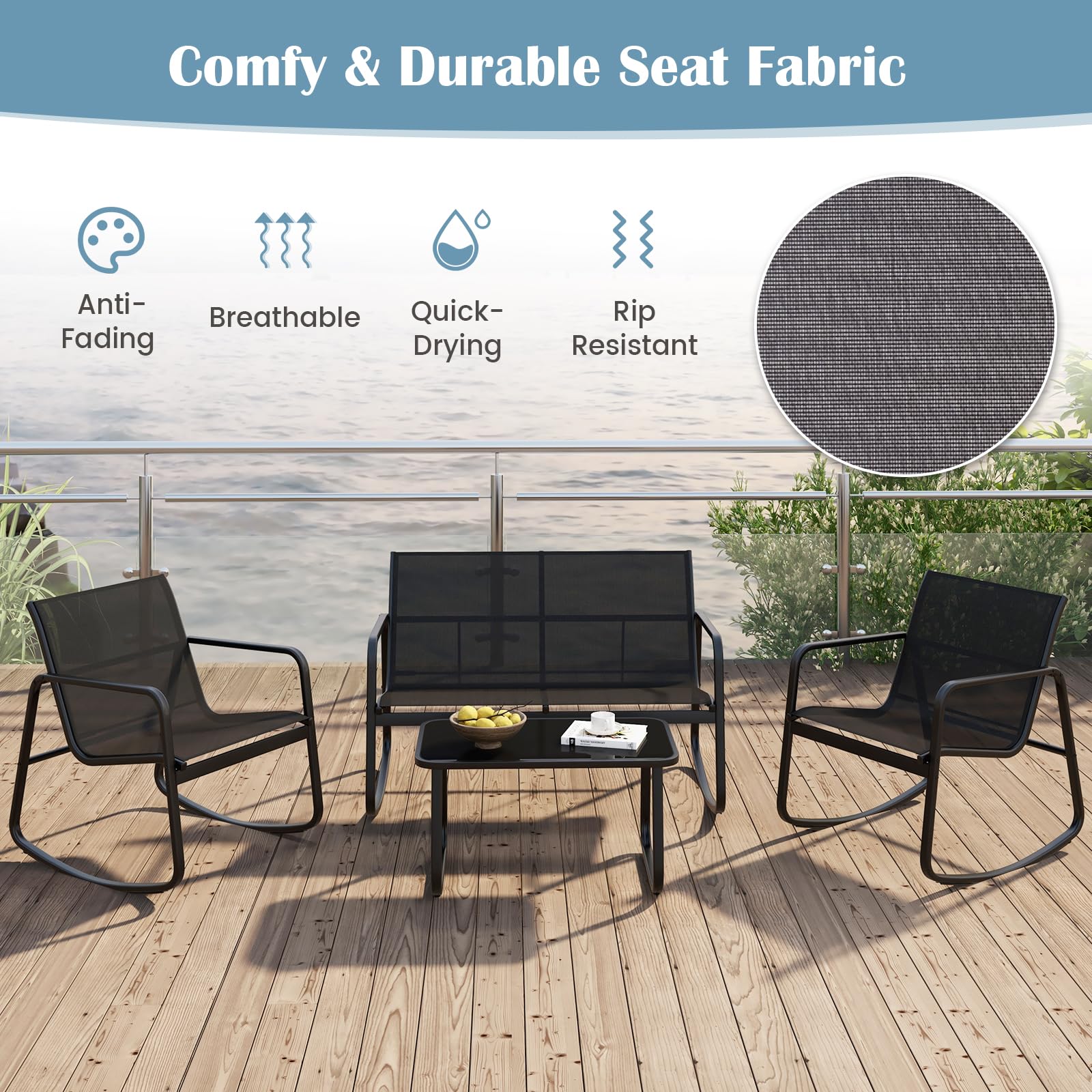 - Upgraded Seat Fabric: With comfy and durable seat fabric which is also breathable and quick-drying, the rocking chairs are comfortable and cool to sit. Also, the seat fabric is anti-fading and rip resistant for long-time use.