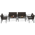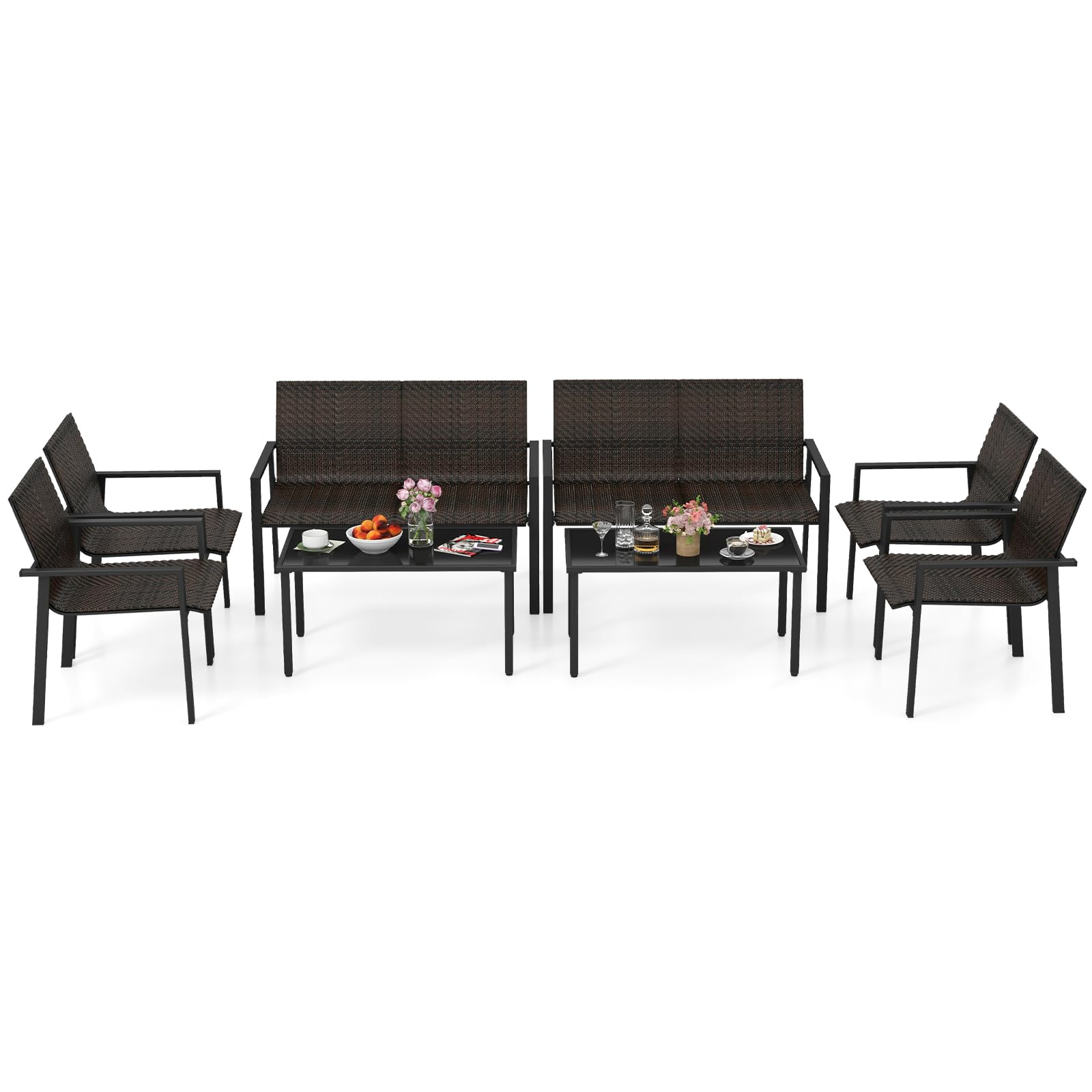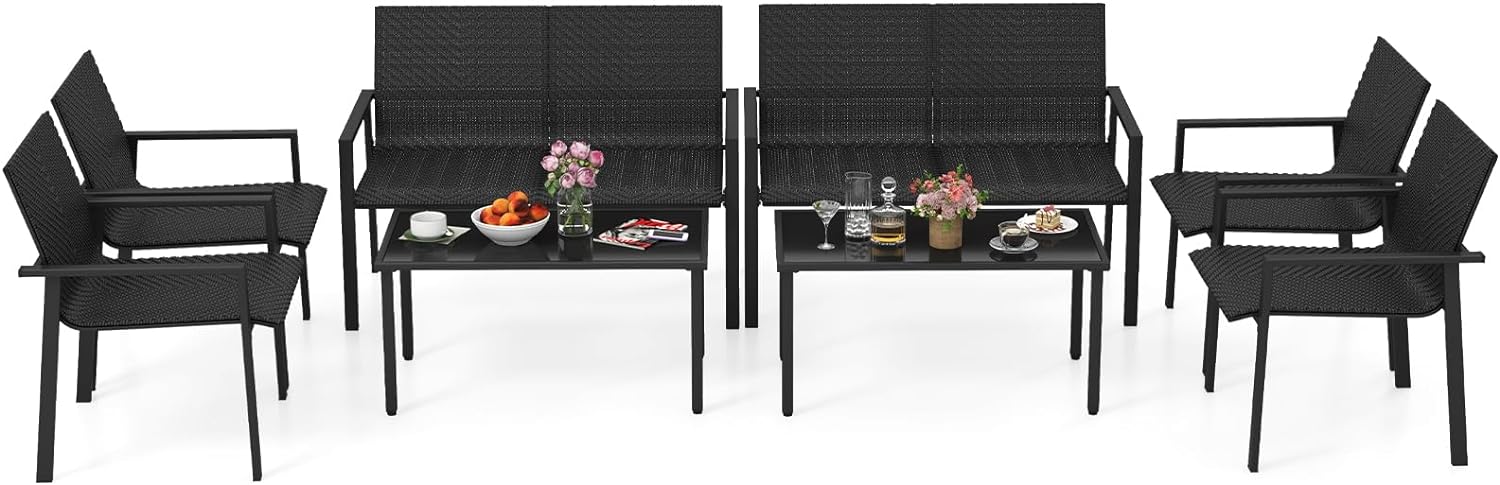 With better machine-woven quality, the rattan chairs feature refined look that resists fading. Coupled with ergonomic design, every seat promises relaxation, easing back stress. The strong metal framework ensures longevity while adjustable footpads add extra stability. Moreover, the spacious coffee table with a sleek tempered glass top offers more convenience for you to fetch food or drinks. This 8-piece patio set, complete with two chairs, a loveseat, and a coffee table, allows for personalized layout, effortlessly adapting to your outdoor space. Elevate your patio to a haven of comfort with this exquisite furniture set.