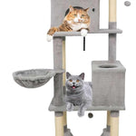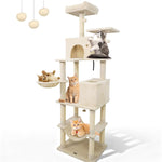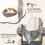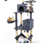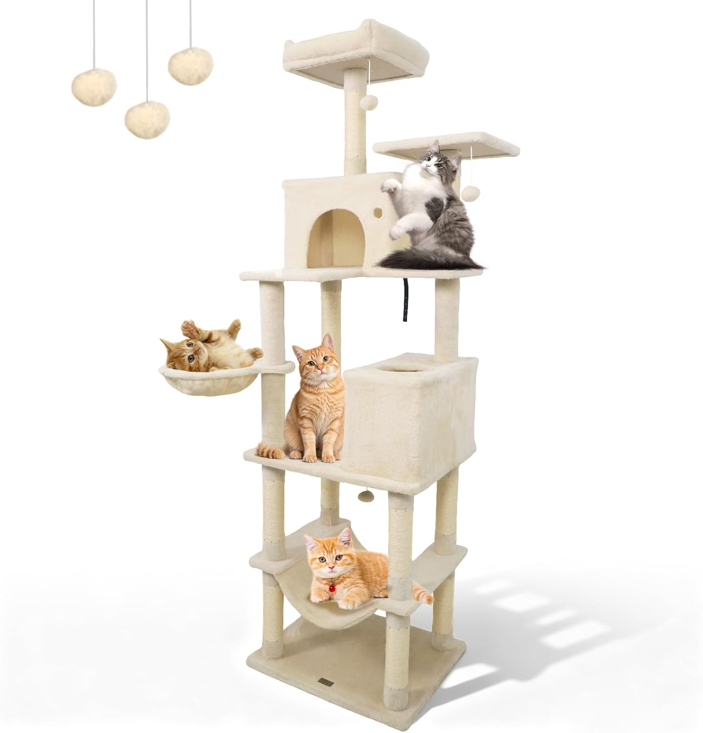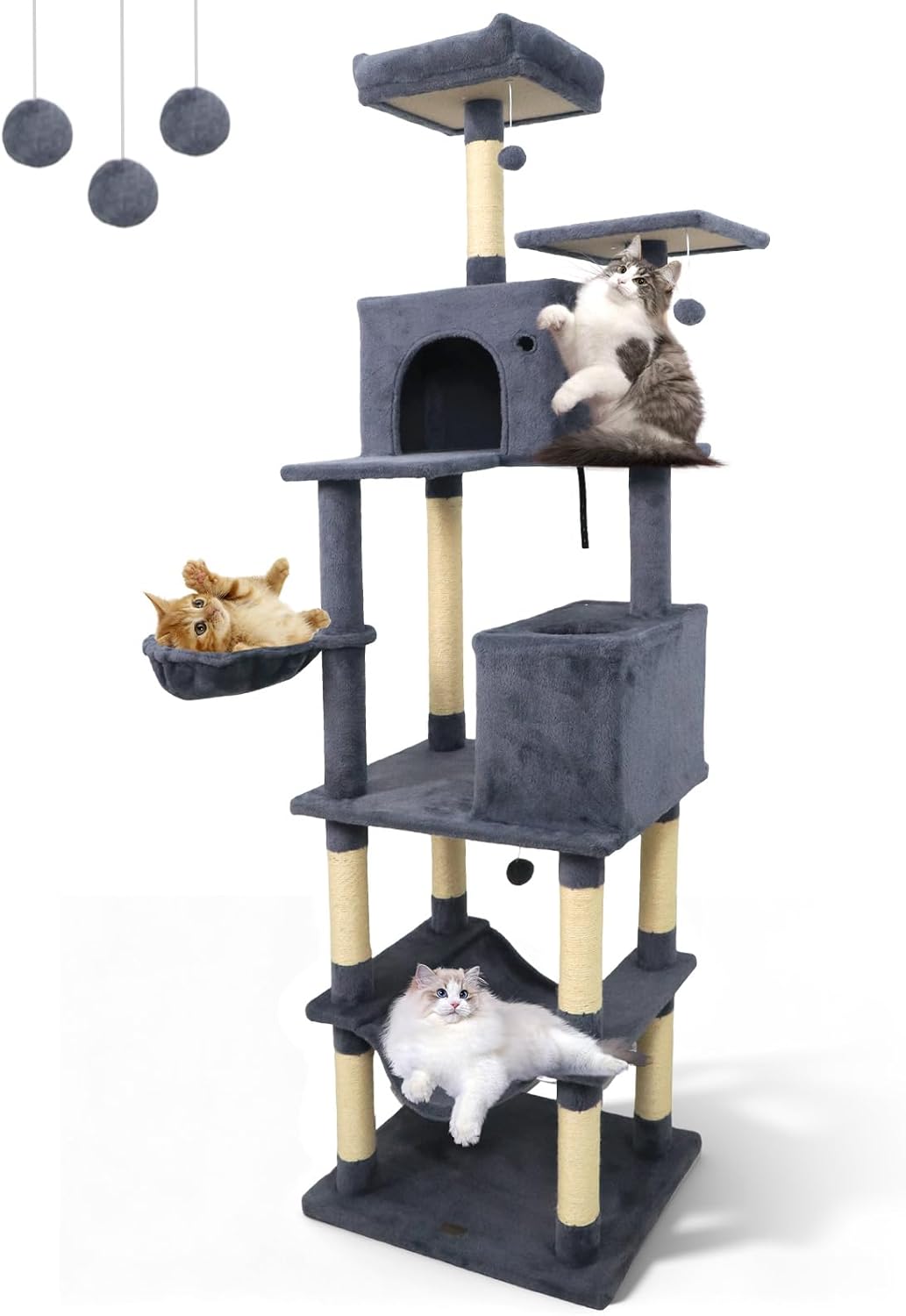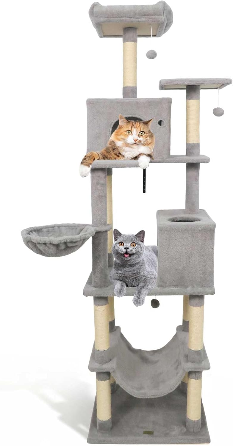 Our multi-level cat tree measures 23.5” x 19” x 80” (L x W x H), thoughtfully designed for homes with multiple cats. The spacious structure stands tall, offering a variety of elevated lounging areas, roomy condos, and unique resting options like a soft hammock and a cozy basket. Multiple built-in scratching posts and hanging toys support your cats’ playful and natural instincts, helping to keep them active and entertained throughout the day. Constructed with a wide, sturdy base and equipped with an anti-toppling device, this cat tree ensures stability and peace of mind, even during group play. Each tier is padded with plush, soft fabric and finished with reliable natural sisal, providing comfort and safety at every level. With plenty of platforms and hideouts, this cat tree gives every cat a special spot to climb, relax, and call their own.