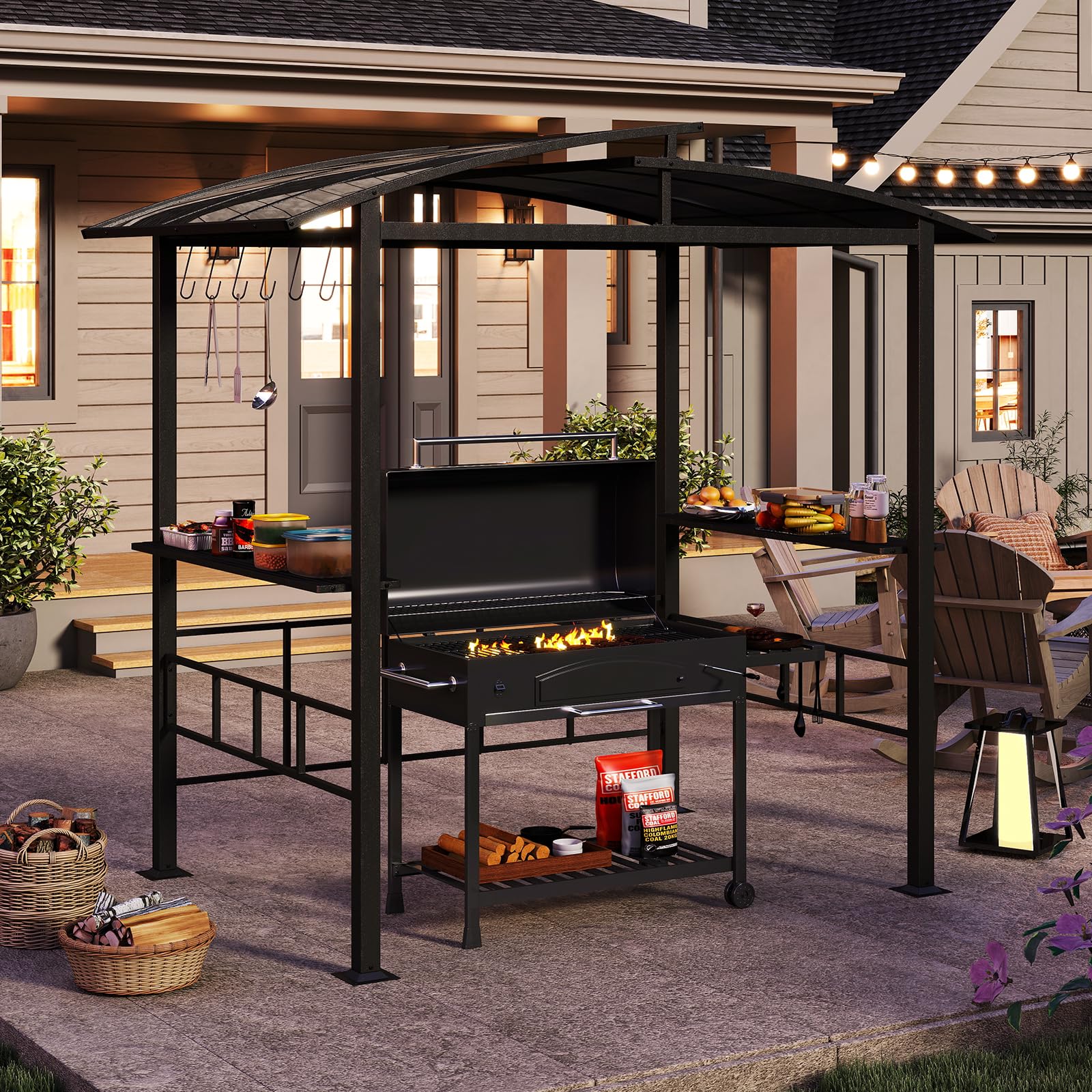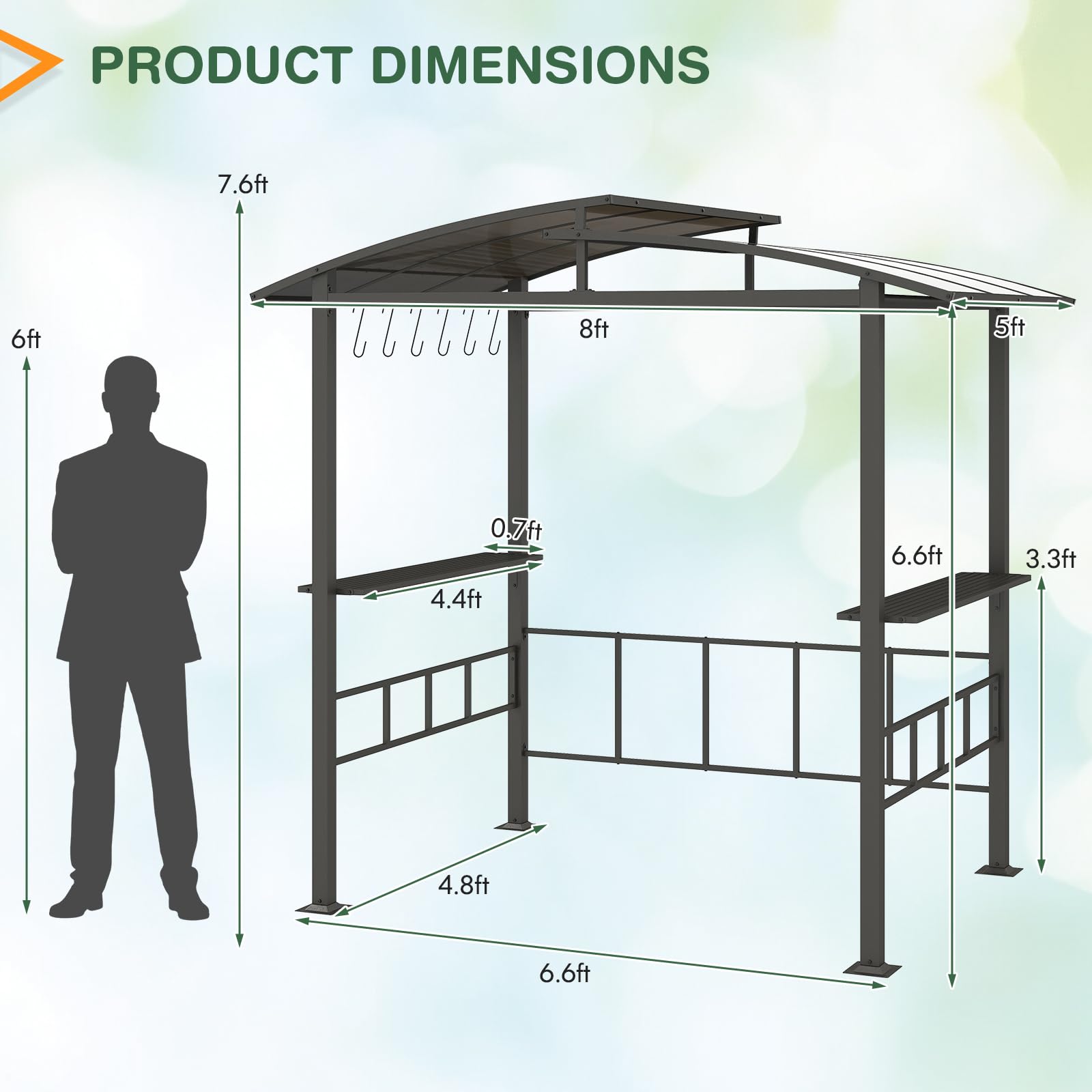 Our 8 x 5 ft hardtop grill gazebo is crafted from a unique polycarbonate roof, which is sun-protective, fade-resistant, waterproof, and anti-aging, providing reliable protection against the elements. Also, its double-tiered roof design facilitates effective smoke and heat release, increasing stability and comfort during use. For unmatched stability and safety, the shelter features pre-drilled anchor plates, paired with 8 metal stakes for fixation on soft grounds and 8 expansion screws for fixation on hard grounds. Other than that, it is equipped with 2 side metal shelves and 6 hanging hooks, providing easy access to grilling accessories. Enjoy BBQ outdoors with family and friends, create unforgettable memories!