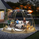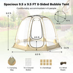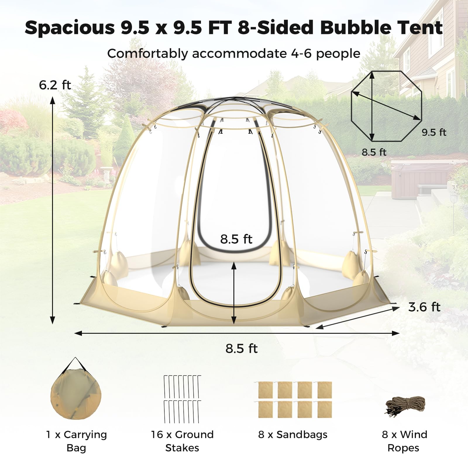 Our spacious 9.5 x 9.5 FT 8-sided bubble tent is designed for family gatherings or friends parties, which could comfortably accommodate 4-6 individuals. This versatile shelter is perfect for various outdoor endeavors, featuring rapid deployment, resilient construction, 2 expansive zippered entries, and 2 side zippered windows. Its transparent PVC walls offer an impressive 540° panoramic view, making it an ideal winter tent for appreciating outdoor vistas comfortably away from the cold. Built to withstand diverse conditions, this pop up shelter utilizes sturdy fiberglass rods, comes with 16 ground stakes, 8 wind ropes, and 8 sandbags for enhanced stability on any terrain. Additionally, this foldable and portable gazebo is crafted for quick assembly and easy portability, catering excellently to outdoor gatherings, camping trips, or sporting events. It ensures not only ease of use but also a remarkable viewing experience throughout the seasons.