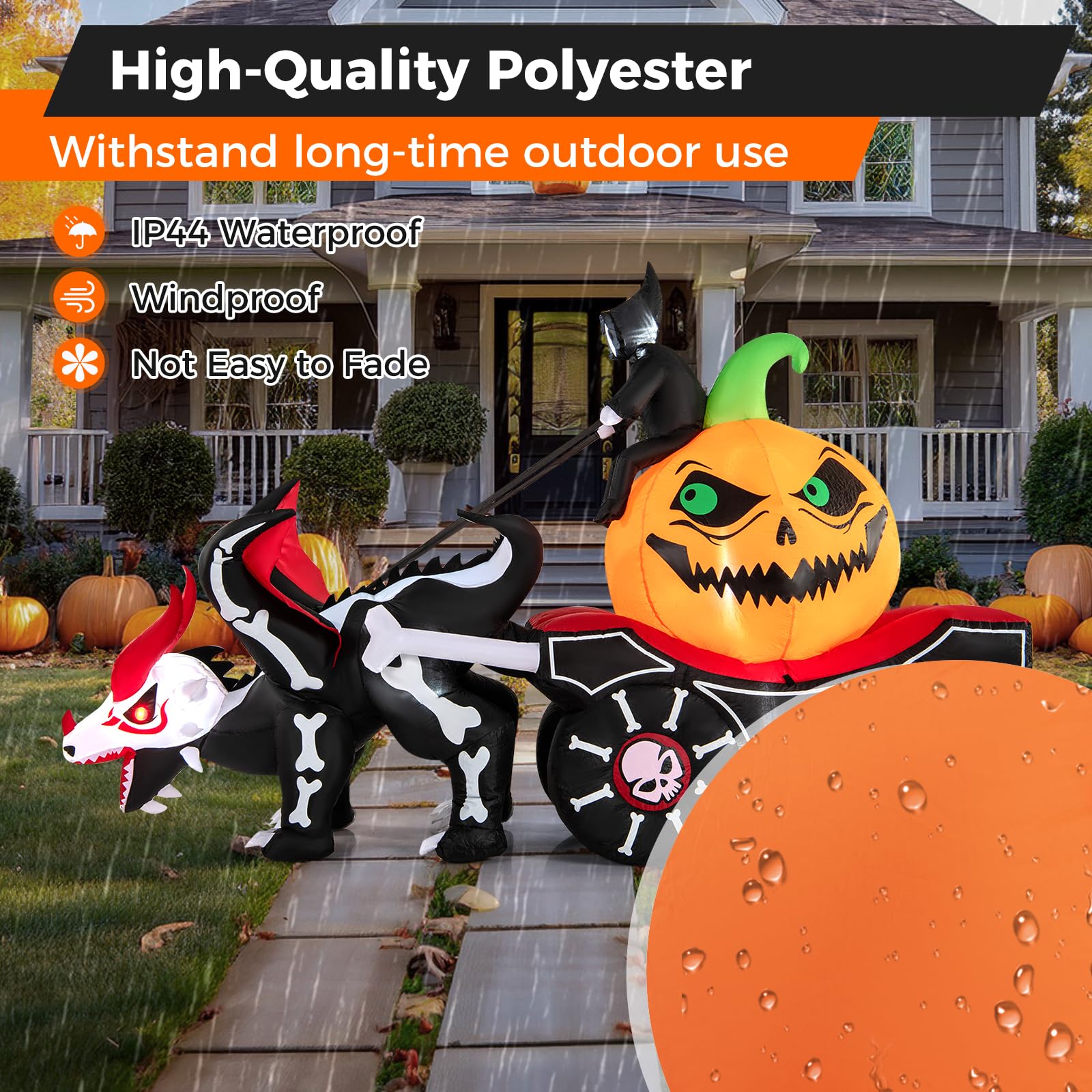 - High-Quality Polyester: Mainly made of weather-resistant polyester, this Halloween inflatable carriage is IP44 waterproof, windproof and not easy to fade, withstanding long-time outdoor use and maintaining ghastly appearance year after year.