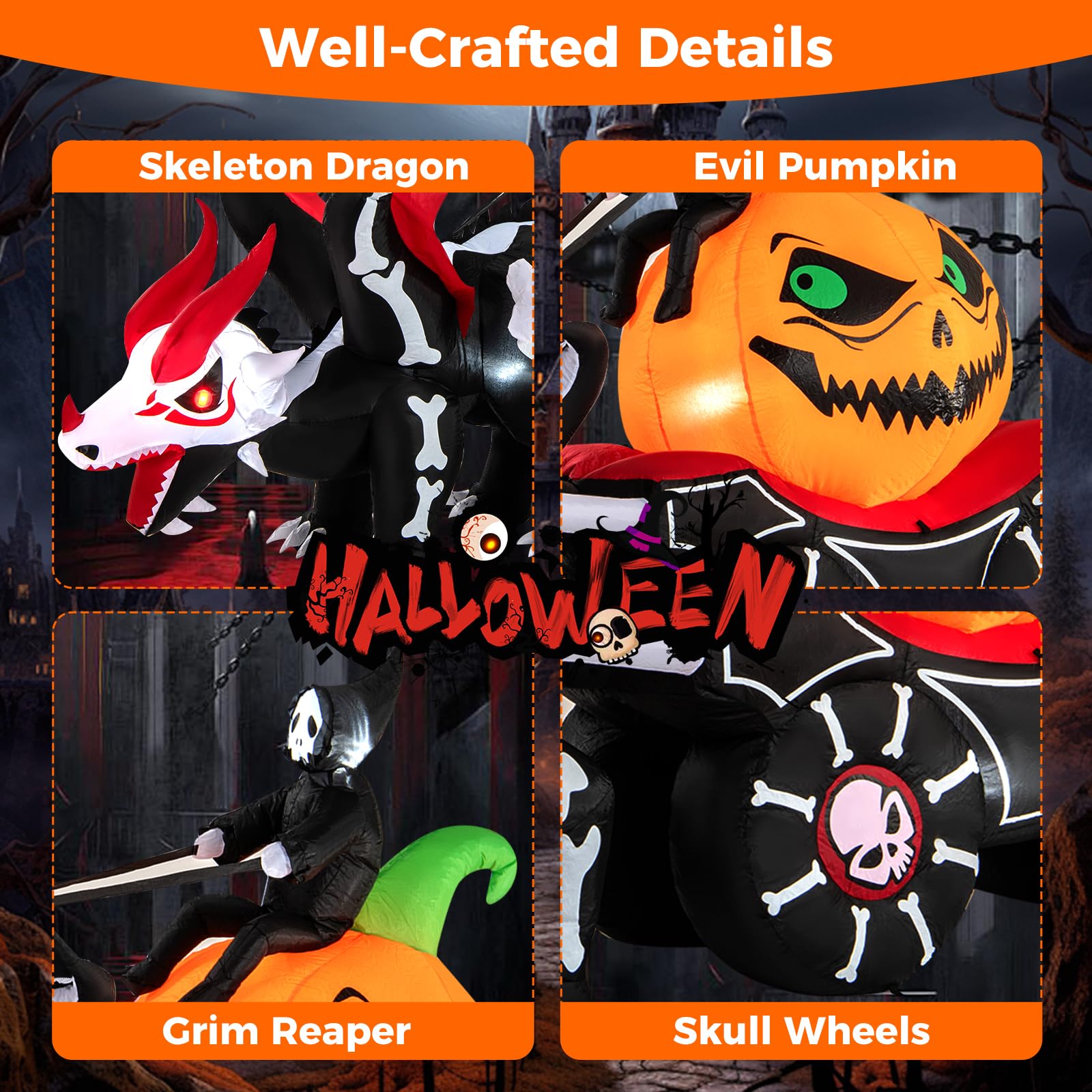 - Reaper Driving Carriage: Experience the thrilling allure of a grim reaper driving a unique carriage with a skeleton dragon, an evil pumpkin and 4 skull wheels, expertly crafted for an eye-catching Halloween display.