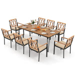 This patio dining set includes 1 table and 8 chairs, which is an ideal choice for family meals, barbecues, or casual relaxation in various outdoor settings. The heavy-duty metal construction ensures enduring stability, while the acacia wood contributes a touch of sophistication. The dining table features a built-in umbrella hole, offering a perfect solution for sun protection (umbrella base needed). The ergonomic chairs, coupled with removable and thick padded cushions, ensure comfort throughout your outdoor gatherings. Moreover, the maintenance is a breeze thanks to the detachable cushion covers.