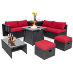 Coming with a premium fire pit table, this patio set will bring you much warmth as well as endless comfort. The fire table possesses a convenient igniting device which makes it easy to ignite and adjust the flame. And the stainless steel burner can withstand high temperatures for long-time use. By removing the lid, you can use it as a common table. Additionally, all the sofas are quite cozy to sit on with sponge-filled cushions. You can also put your feet on the ottoman for extra comfort. The cushions are simple to maintain with the zipper design. What's more, the coffee table and storage box allow you to place items for easy fetch. This 9-piece patio set is of high stability with a reinforced steel structure. And the rattan surface makes it weatherproof for outdoor use. When not in use, 8 pieces of sofa set (fire table not included) can be stored in a rectangular shape to save space. Moreover, two waterproof covers give considerate protection to the whole set, too. Come to relax and enjoy a good time with our 9-piece patio rattan set.