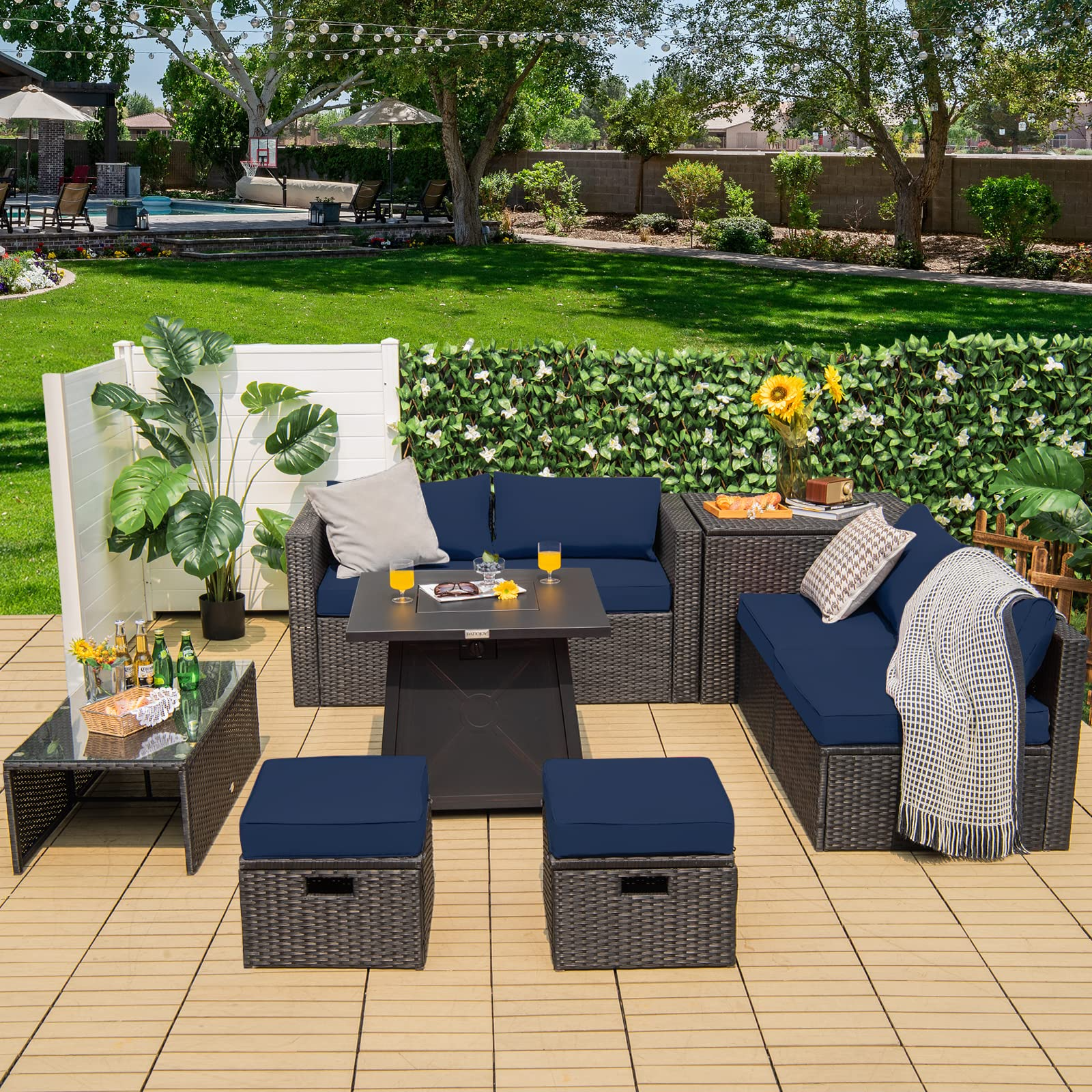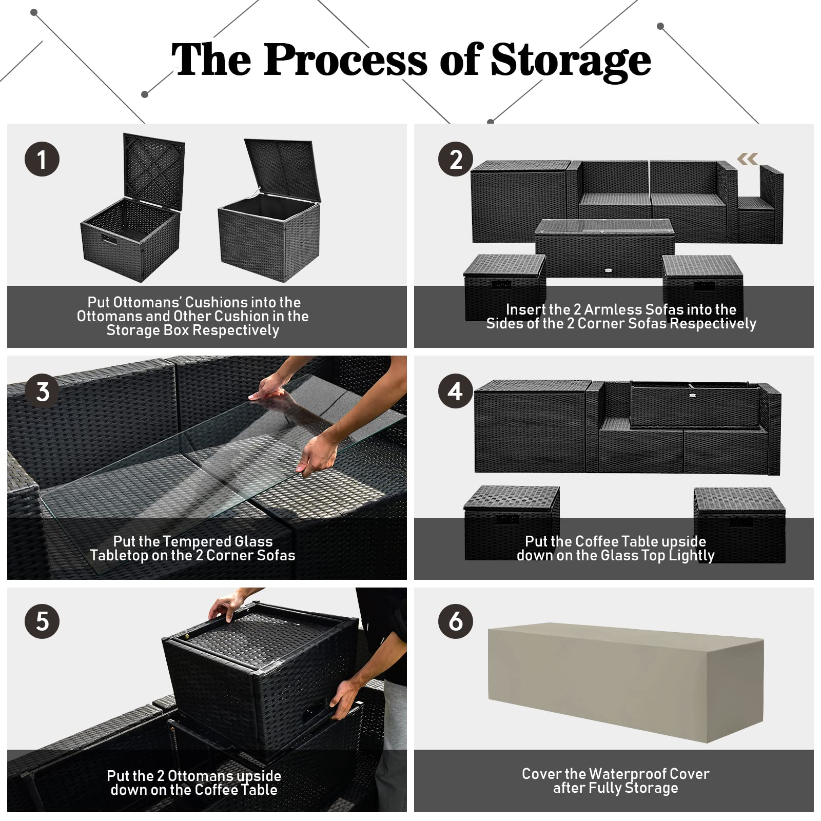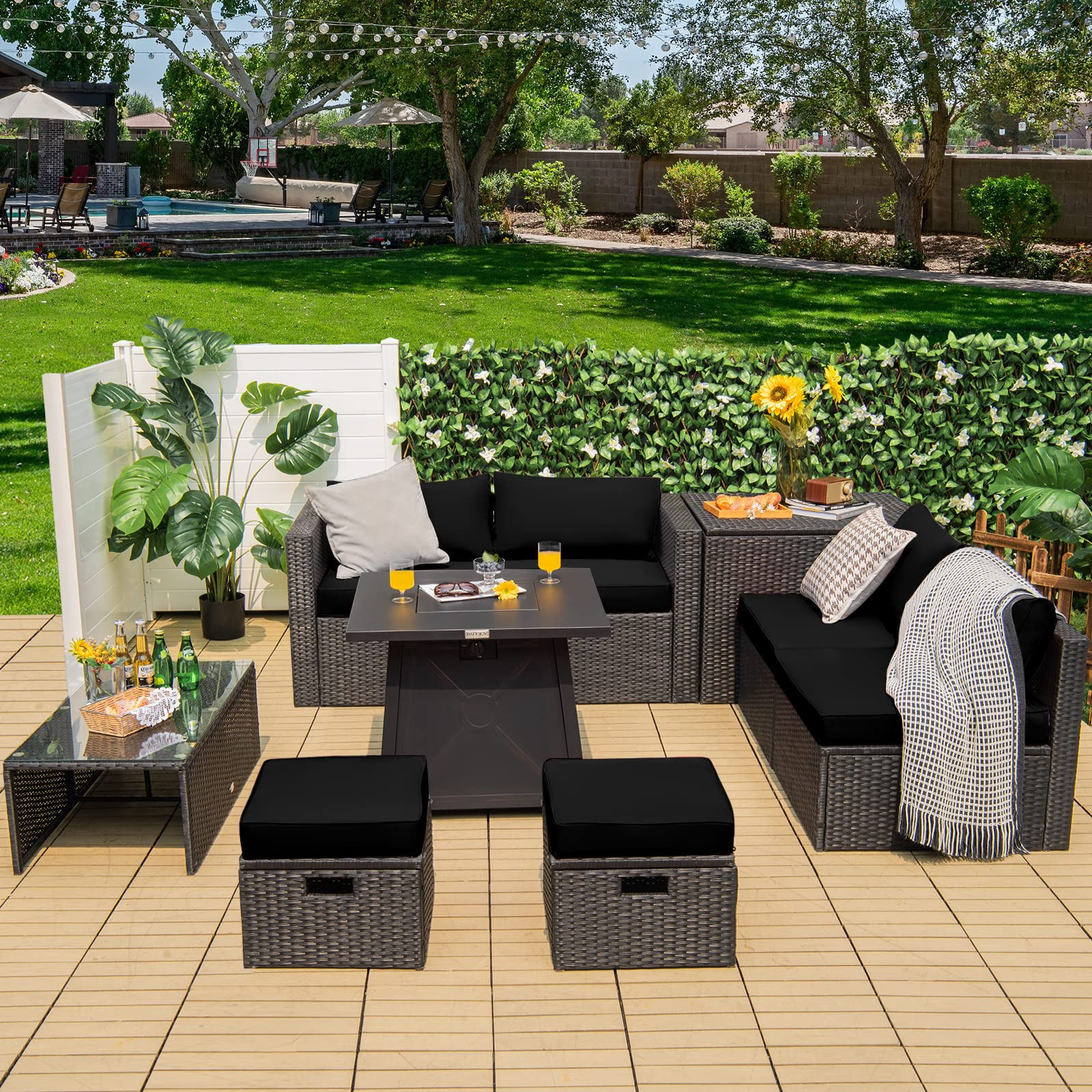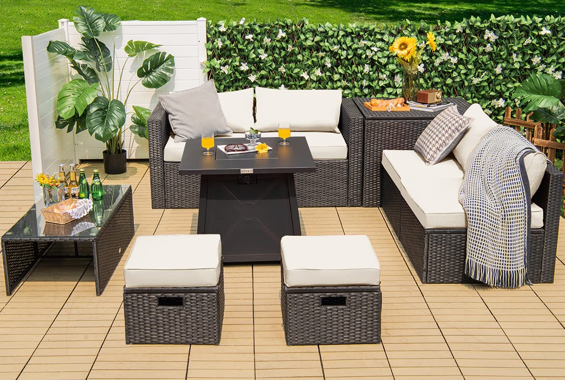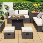 - Free Combination & Space Saving: The storage box and coffee table offer you much convenience to store items for outdoor use. All 9 pieces can be freely combined according to your needs, thus fitting the area of different sizes. When not in use, you can store the 8-piece sofa set (fire table excluded) in a rectangle shape, which measures only 93"x 29.5"x 26"(L x W x H), saving much space for storage.